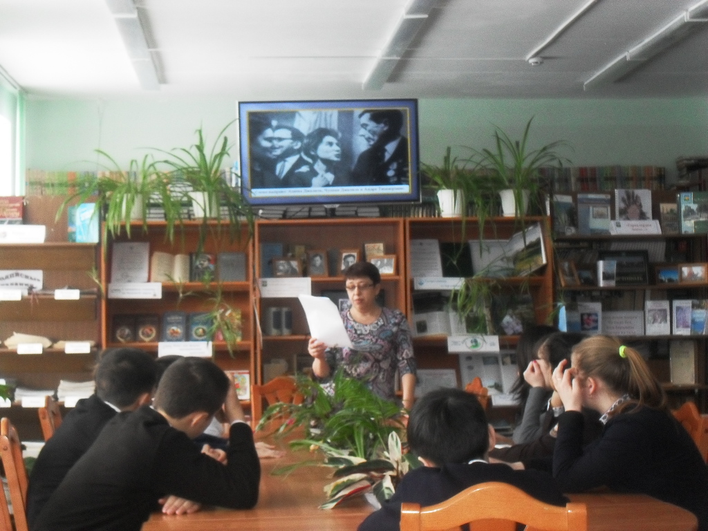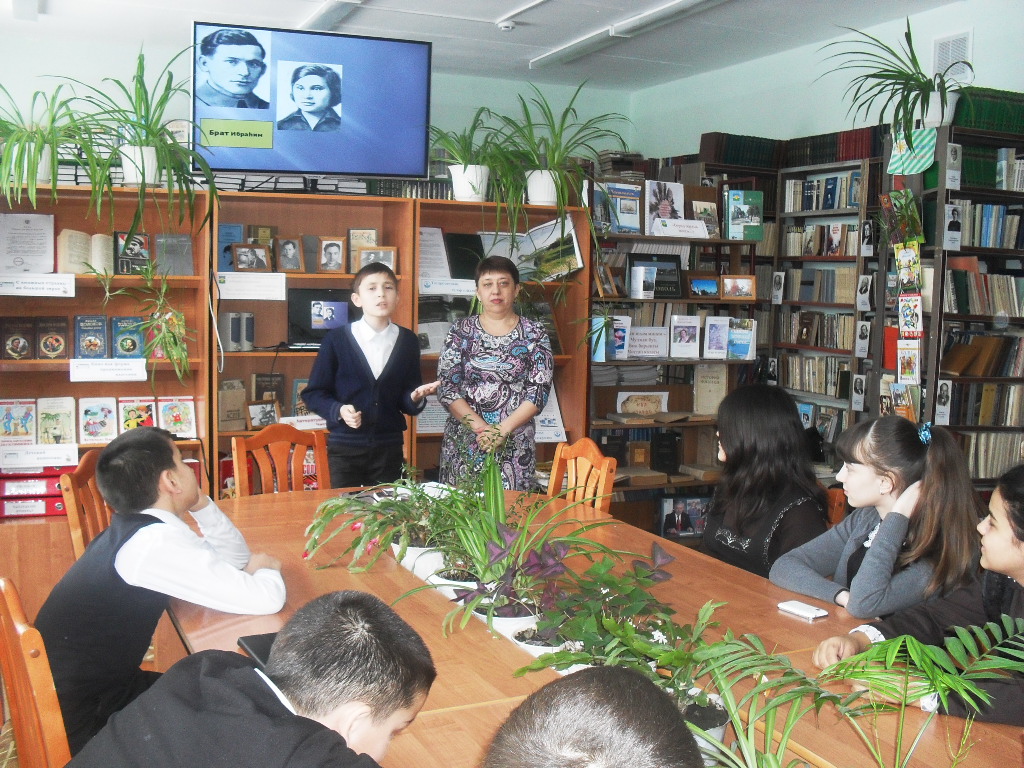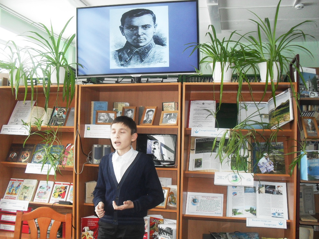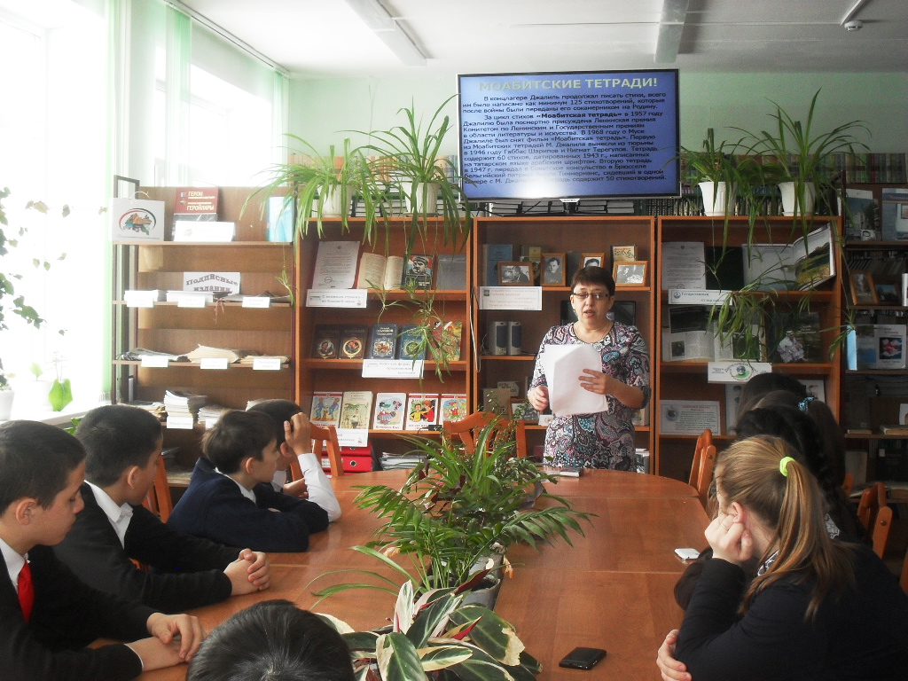 Библиотека филиал№1 совместно со школой №5 проводили литературный вечер « Бессмертная песня», посвященный 110 –летию герою писателю М. Джалилю. ( 7 б класс учительница Залалутдинова Г. Т.)