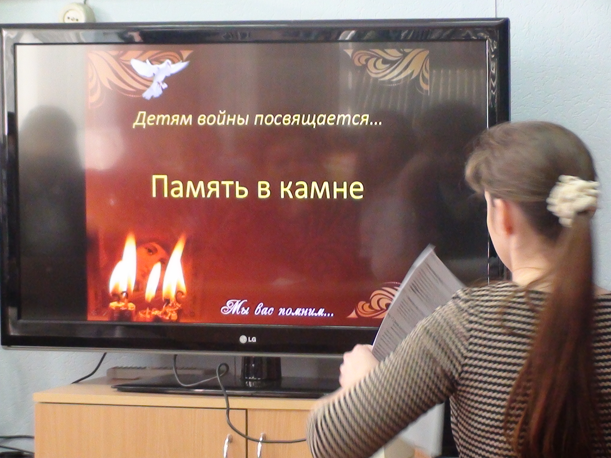 Во второй части мероприятия учащимся показали презентацию о памятниках «Память в камне», посвященную детям погибшим в года Великой Отечественной войны. Её представила сотрудник читального зала Гольцова Ю.О.