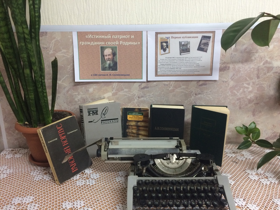 Книжная выставка «Истинный патриот и гражданин своей Родины» — это яркое свидетельство необычно сложной, но так необходимой современному читателю, истории жизни А.Солженицына.