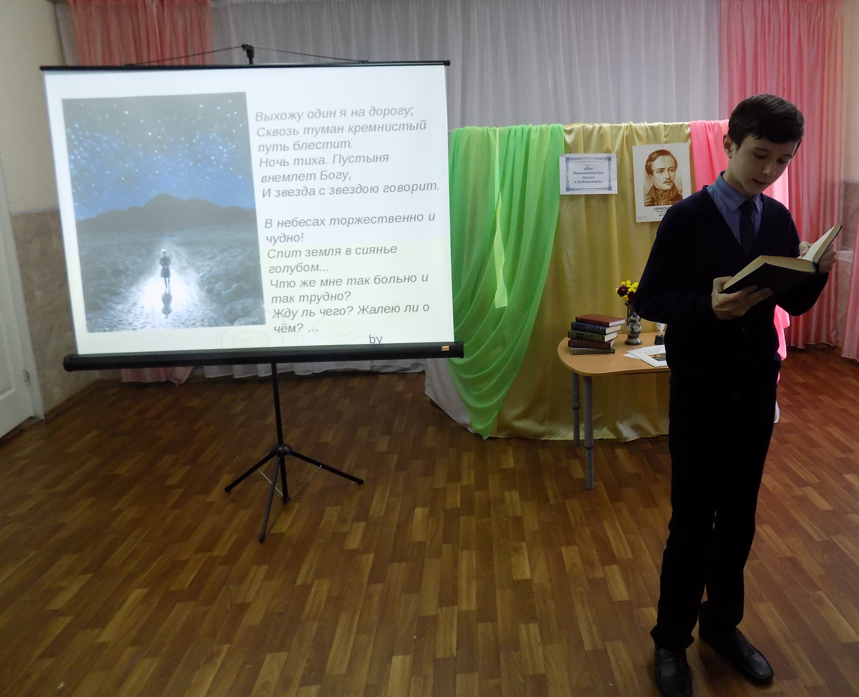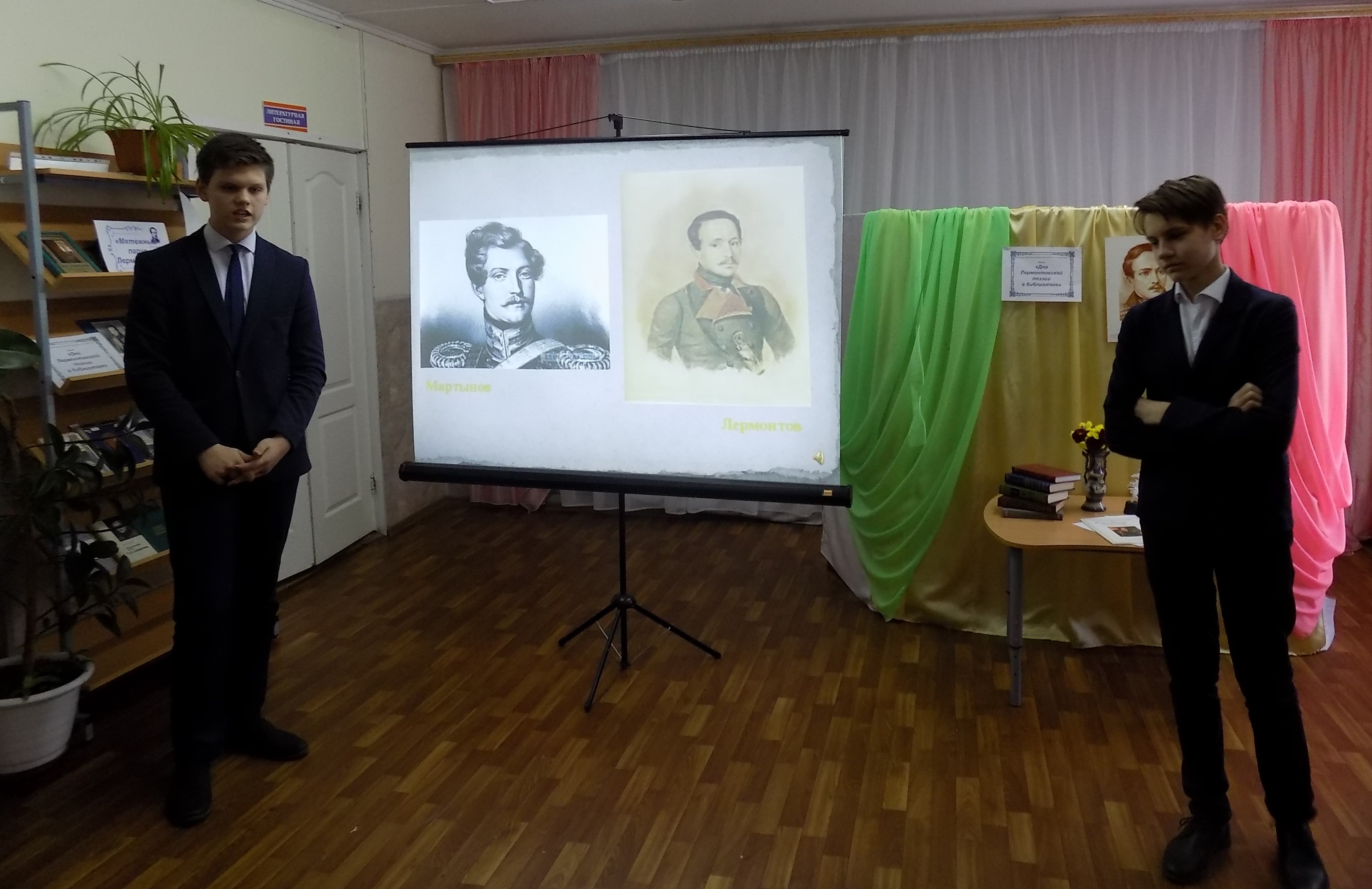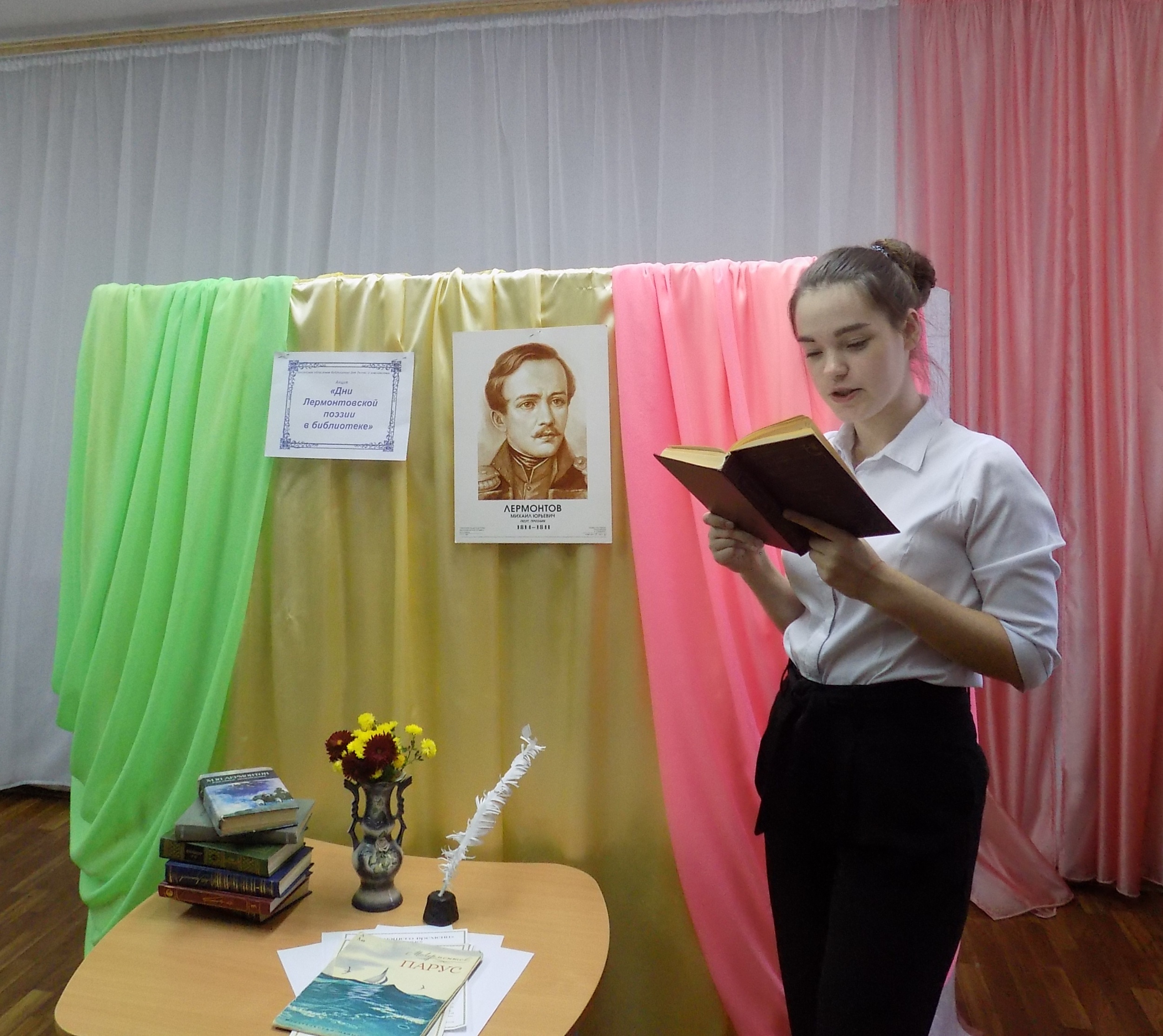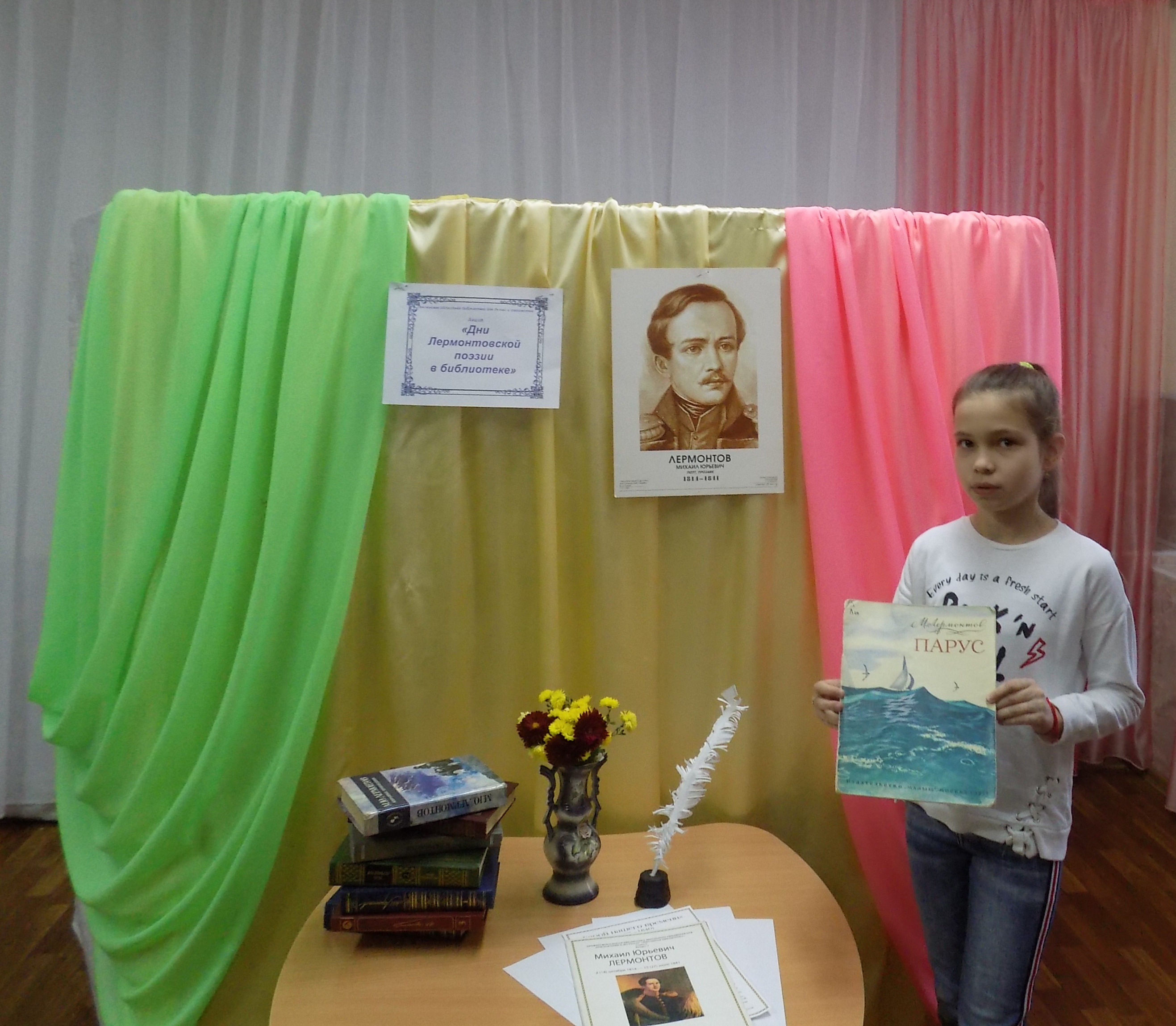 Центральная детская библиотека приняла участие вVIМежрегиональной акции« Дни лермонтовской поэзии в библиотеке». Акция проводилась по инициативе ГКУК «Пензенская областная библиотека для детей и юношества». Всего в акции приняли участие 86 учащихся СОШ №16, гимназии №3. Участвуя в акции, ребята прикоснулись к богатому культурному наследию, оставленному великим поэтом, прозаиком и драматургом Михаилом Юрьевичем Лермонтовым. Сотрудники детской библиотеки оформили для ребят книжную выставку о жизни и творчестве поэта « Мятежный парус Лермонтова», читательский уголок « Лермонтов: знакомый и незнакомый». Читатели с удовольствием знакомились с лучшими произведениями Михаила Лермонтова, с иллюстративным материалом о его творчестве и жизненном пути. На младшем абонементе и в литературной гостиной в формате «свободного микрофона» наши читатели декламировали стихи поэта. Читали громко и тихо, с выражением и, проглатывая слова, волнуясь, и с чувством собственного достоинства. « Осень», « Бородино», « Утес», « На севере диком»,« Парус», «Нет, не тебя так пылко я люблю», «Как часто пестрою толпою окружен», « На смерть поэта» − вот неполный перечень стихов, прочитанных учащимися. Для учащихся 8А класса « Гимназии №3» был подготовлен литературно – поэтический вечер « Выхожу один я на дорогу….». Лейтмотивом вечера – стала тема одиночества поэта. Главный библиотекарь Хамадиева И.А. познакомила ребят с воспоминаниями современников о Лермонтове, с его стихами, в которых отразилась драматическая судьба поэта. Мероприятие сопровождалось презентацией « Гляжу на будущность с боязнью..» Короткая, но яркая жизнь Михаила Юрьевича Лермонтова оставила глубокий след в русской литературе.