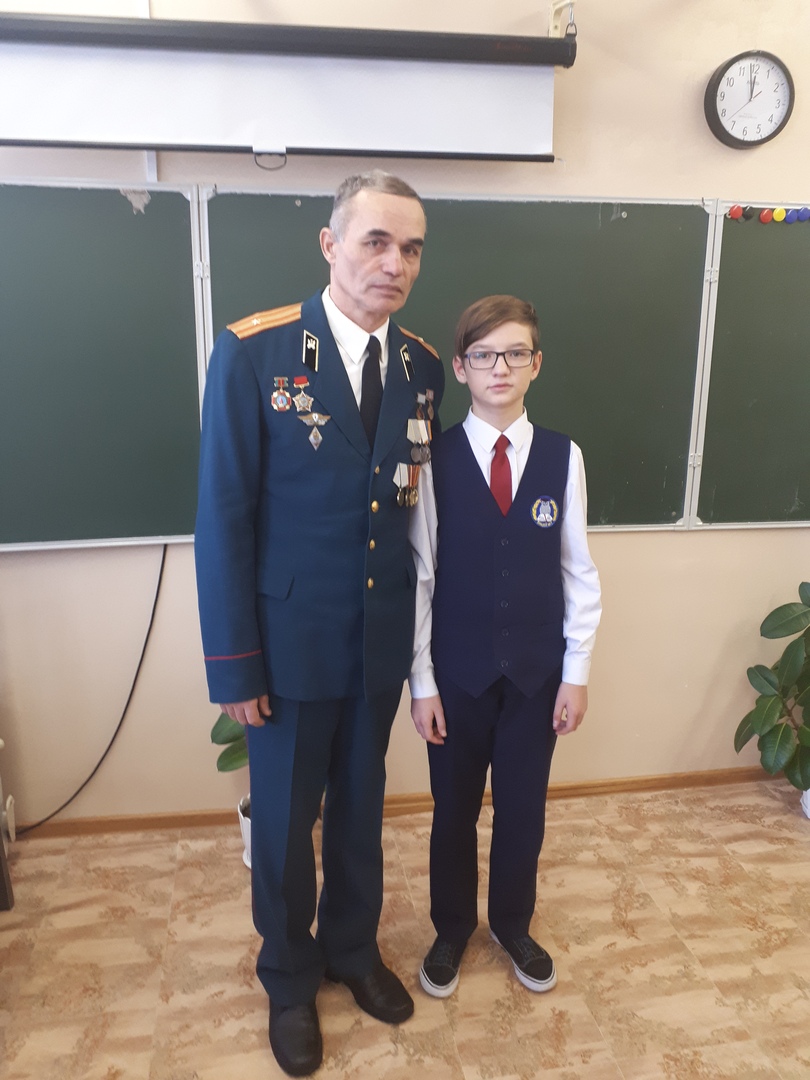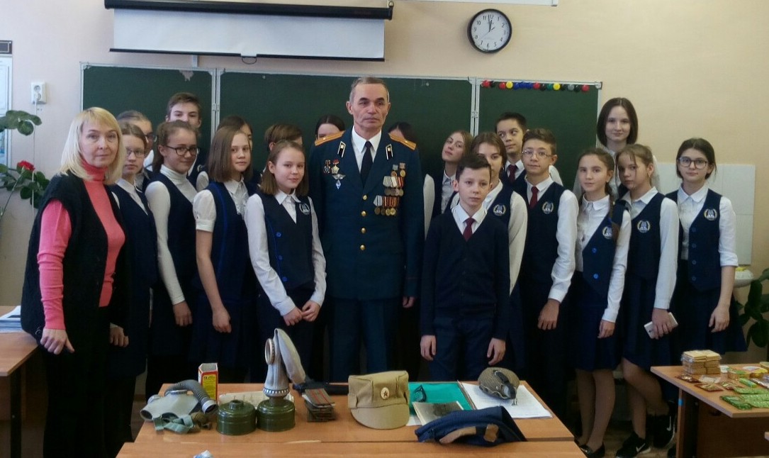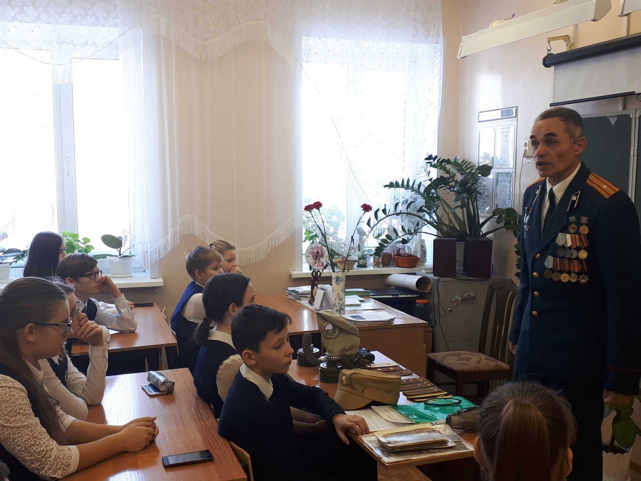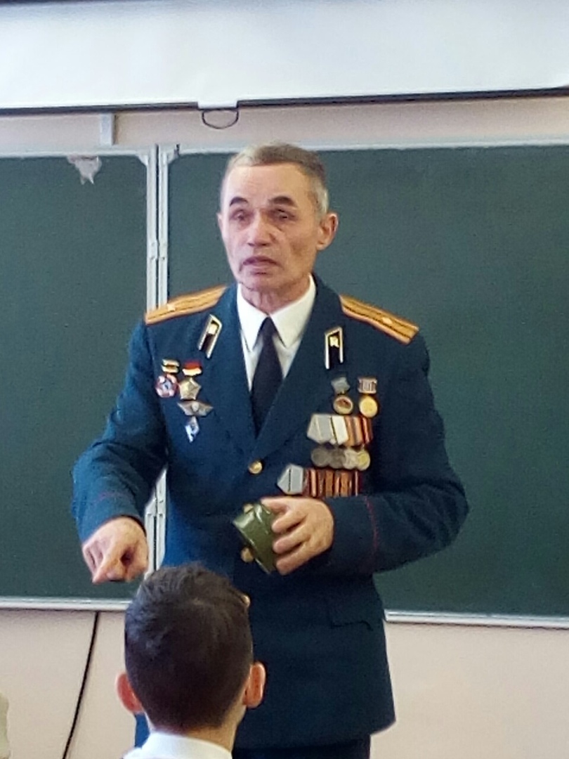 На встречу с детьми пришёл ветеран афганской войны майор запаса Мезинов Павел Васильевич. Он учился в школе №18. Восхищался подвигом солдат Великой Отечественной войны и даже не предполагал, что станет кадровым военным. Он закончил военную академию, служил в Афганистане и Чернобыле. В 1995 году он вышел на заслуженный отдых.
