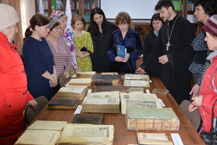 Отец Симеон, настоятель храма во имя Пресвятой Троицы села Чистопольские Выселки представил выставку старинных духовных книг, которая стала настоящим украшением праздника.