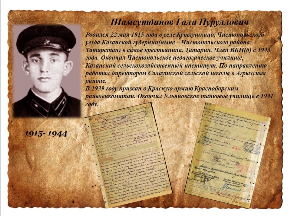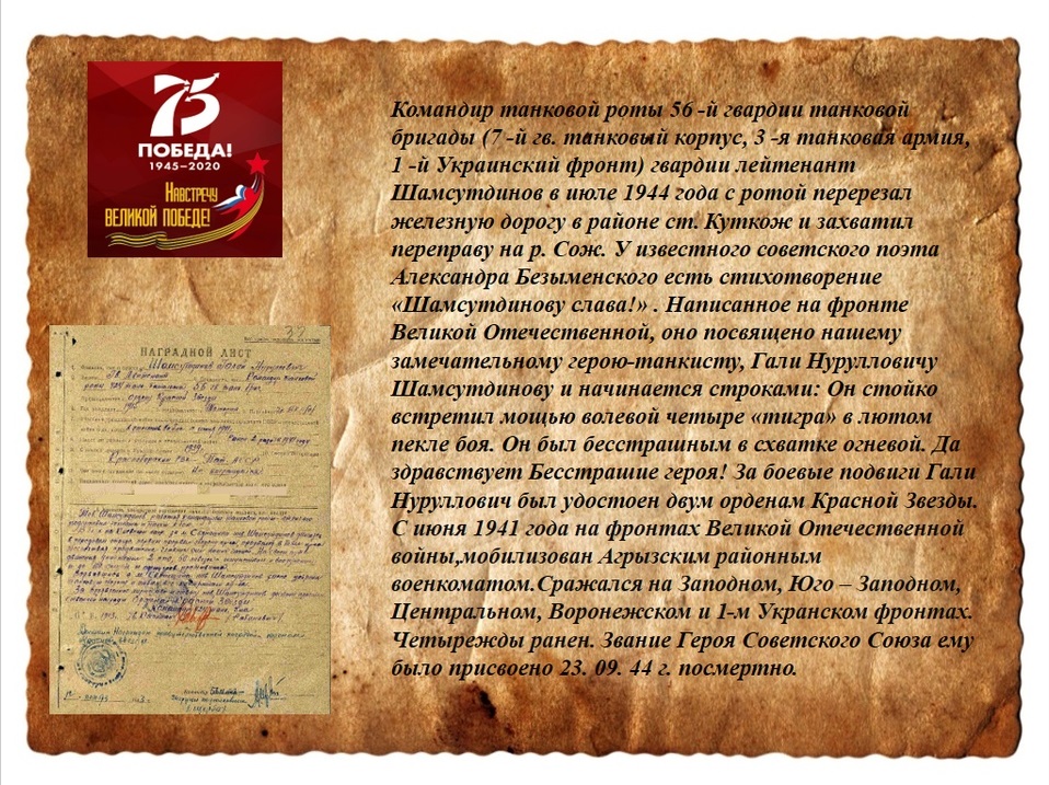Львовско-Сандомирской стратегической наступательной операции; работавший тогда в армейской газете известный поэт А. Безыменский посвятил герою стихотворение «Шамсутдинову слава!».