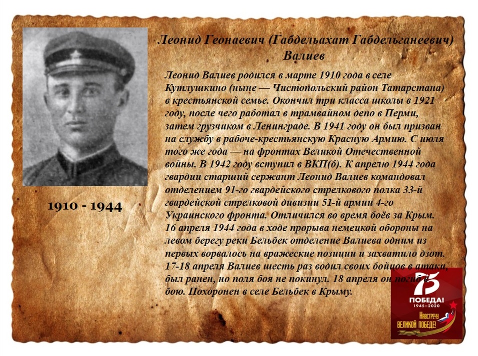 Леонид Геонаевич (Габдельахат Габдельганеевич) Валиев родился в марте 1910 года в селе Кутлушкино (ныне — Чистопольский район Татарстана) в крестьянской семье. Окончил три класса школы в 1921 году, после чего работал в трамвайном депо в Перми, затем грузчиком в Ленинграде. В 1941 году он был призван на службу в рабоче-крестьянскую Красную Армию. С июля того же года — на фронтах Великой Отечественной войны. В 1942 году вступил в ВКП(б). К апрелю 1944 года гвардии старший сержант Леонид Валиев командовал отделением 91-го гвардейского стрелкового полка 33-й гвардейской стрелковой дивизии 51-й армии 4-го Украинского фронта. Отличился во время боёв за Крым.