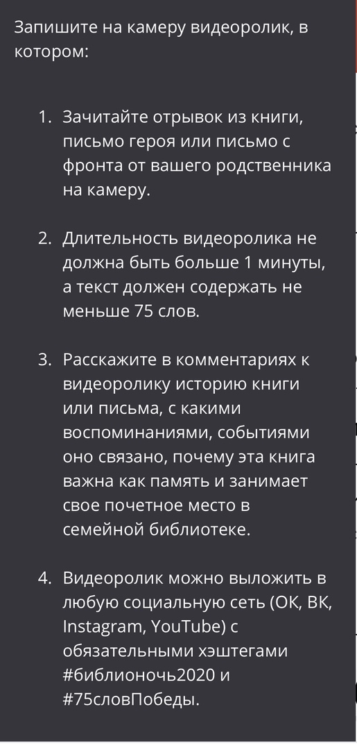 Видеоролик можно выложить в любую социальную сеть (ОК, ВК, Instagram, YouTube) с обязательными хэштегами #библионочь2020 и #75словПобеды.