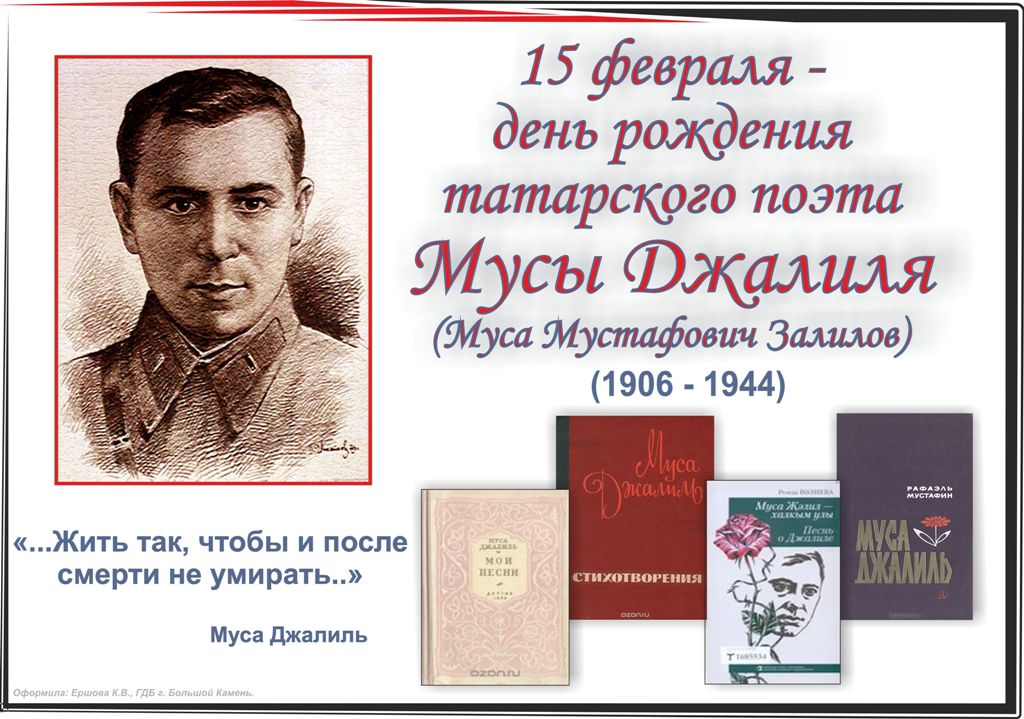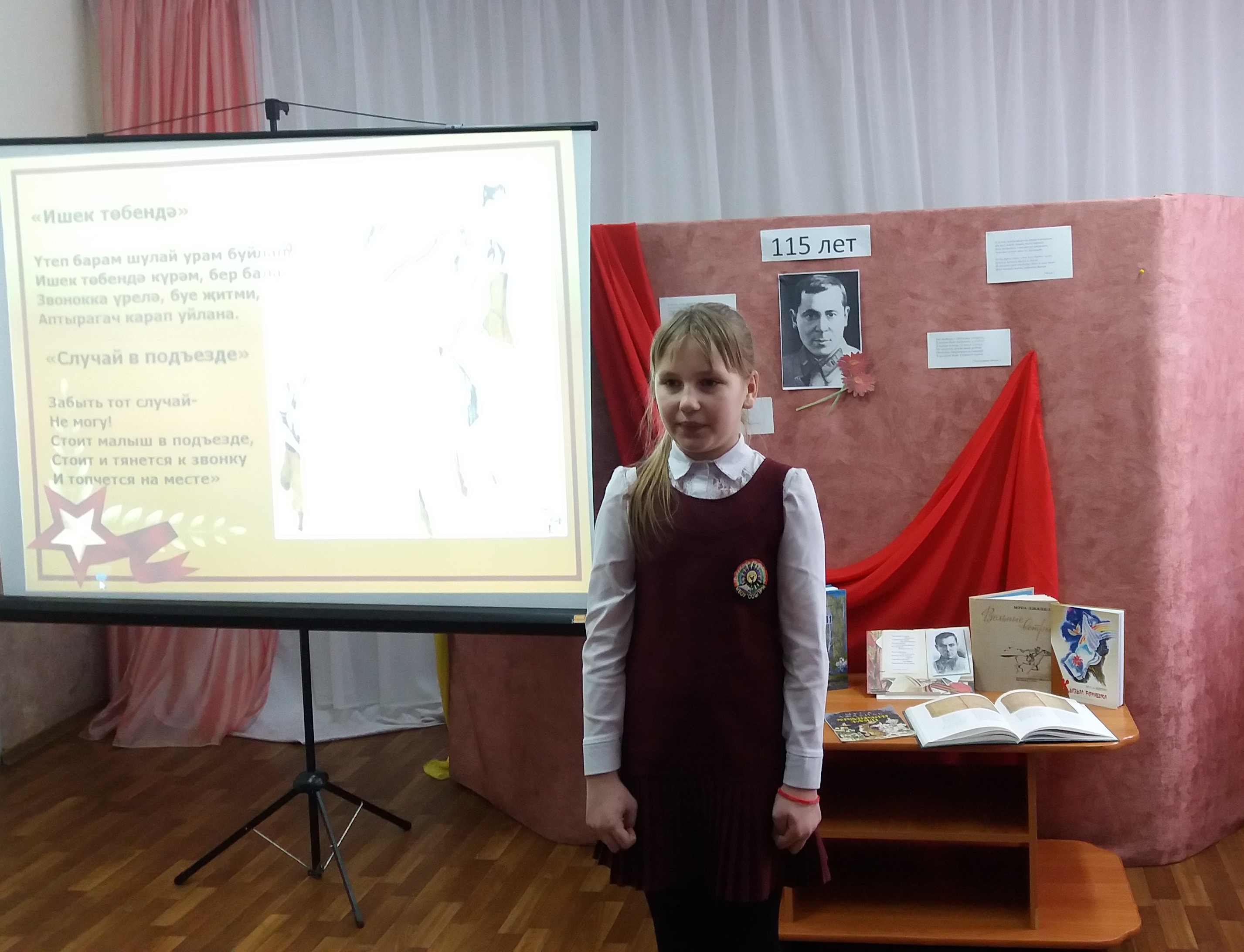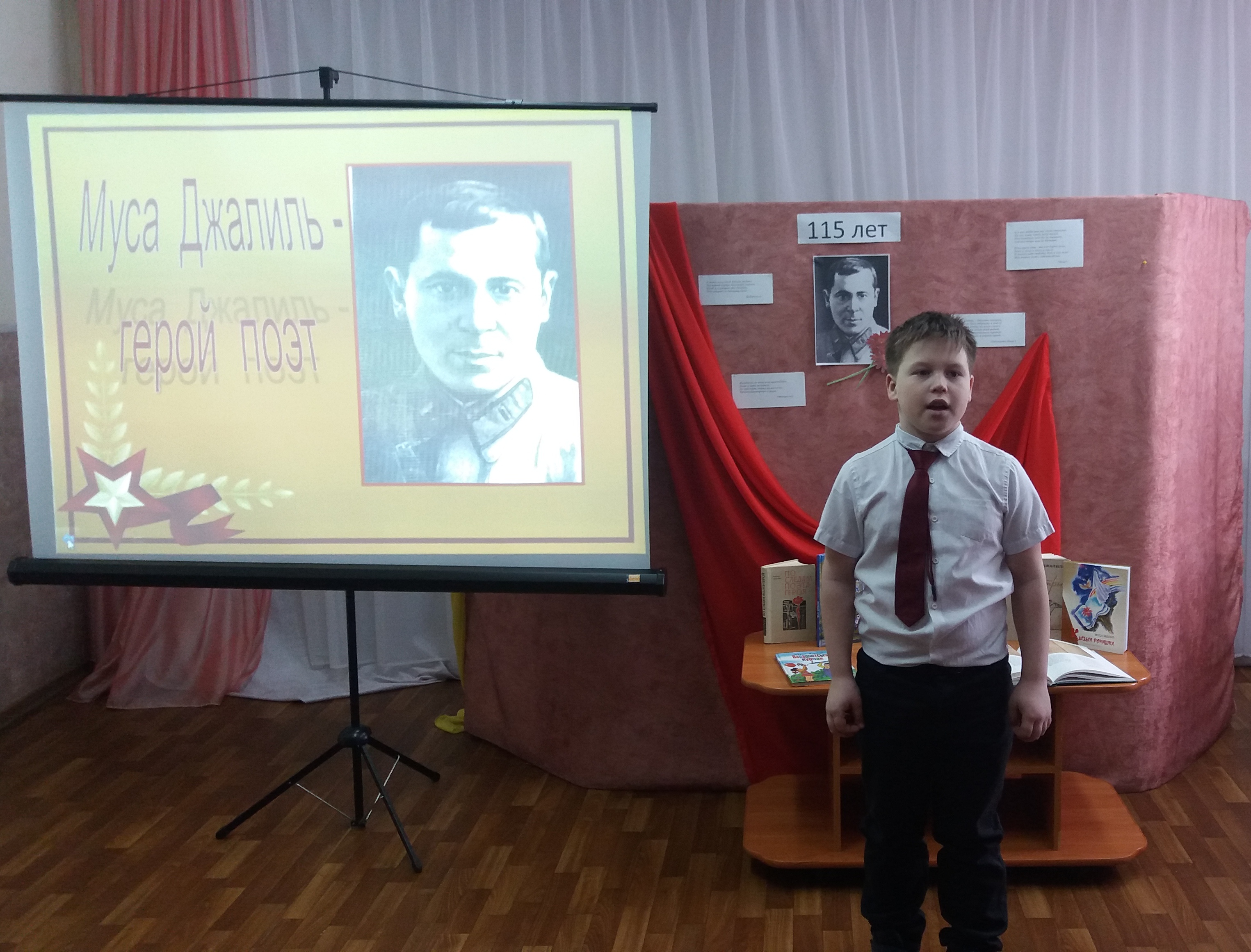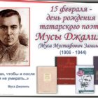 В Центральной детской библиотеке прошел литературно-патриотический час «Я клятву дал — служить своей Отчизне….», к 115-летию со дня рождения великого татарского поэта — героя М. Джалиля. Гостями мероприятия стали учащиеся 4Б класса СОШ 16. Мероприятие началось с блиц-опроса школьников. Ребята отвечали на такие вопросы: Что такое подвиг? Кто такой герой? Какими качествами должен обладать герой? Ребята оказались активными и знающими. Дети с большим интересом прослушали рассказ гл. библиотекаря И.А.Хамадиевой о том, где родился и вырос Муса Джалиль, как он учился и с какого времени начал писать стихи, окунулись в мир воспоминаний о его детстве, узнали интересные факты из биографии. Рассказ сопровождался презентацией « Подвиг Джалиля», в ходе которой дети узнали о суровых фронтовых буднях поэта, о страшном времени, проведенном в фашистских застенках концлагерей, в которых единственным оружием Мусы Джалиля были его стихи. Чтобы полнее раскрыть биографию писателя, его боевой путь зачитывались отрывки из книги Р.Мустафина « Красная ромашка». Особенно заинтересовал ребят рассказ о последних днях жизни поэта, проведенных в Моабитской тюрьме Берлина. Обсуждение книги вызвало интерес у ребят к самостоятельному прочтению. Участники мероприятия читали проникновенные, мужественные стихи Мусы Джалиля. В заключение дети познакомились с выставкой, где были представлены сборники стихов поэта на русском и татарском языках, книги с воспоминаниями родных, соратников, фотоальбомы. Образ поэта-героя, не покорившегося «сорока смертям», дорог людям всего мира, всем, кто ненавидит войну, фашизм, всем, кто ценит отвагу и благородство.