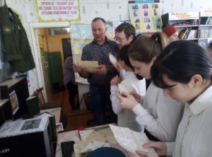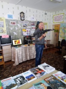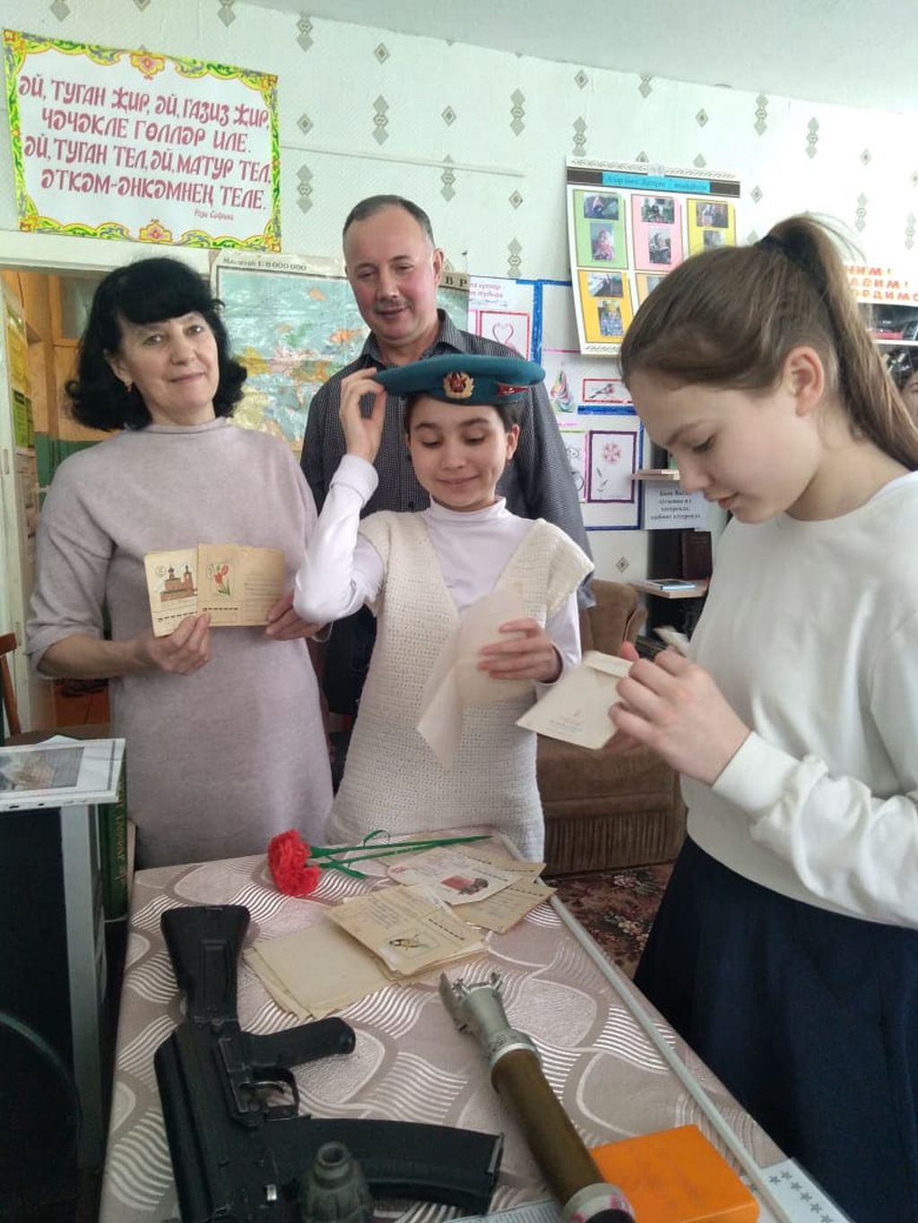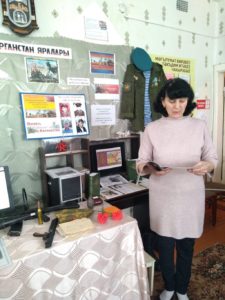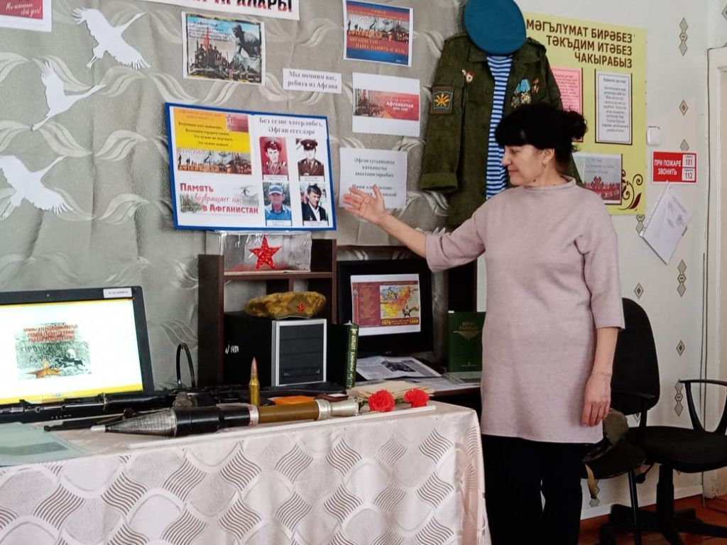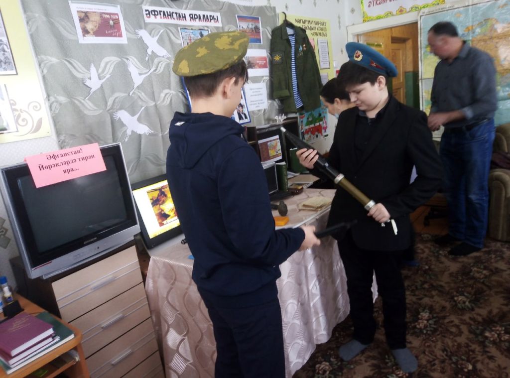Учитель ОБЖ Хайрутдинов И.М. познакомил ребят с оружиями который применяли в Афганистане. Ребятам посчастливилось потрогать , одеть, посмотреть все. Была оформлена выставка «Так служили наши земляки». На выставке представлены альбомы, фотографии, письма, книги. Так же можно увидеть военную форму, автомат Калашникова, полевую аптечку, крупнокалиберный патрон и др. Выставка работает с 15 – 18 февраля.
