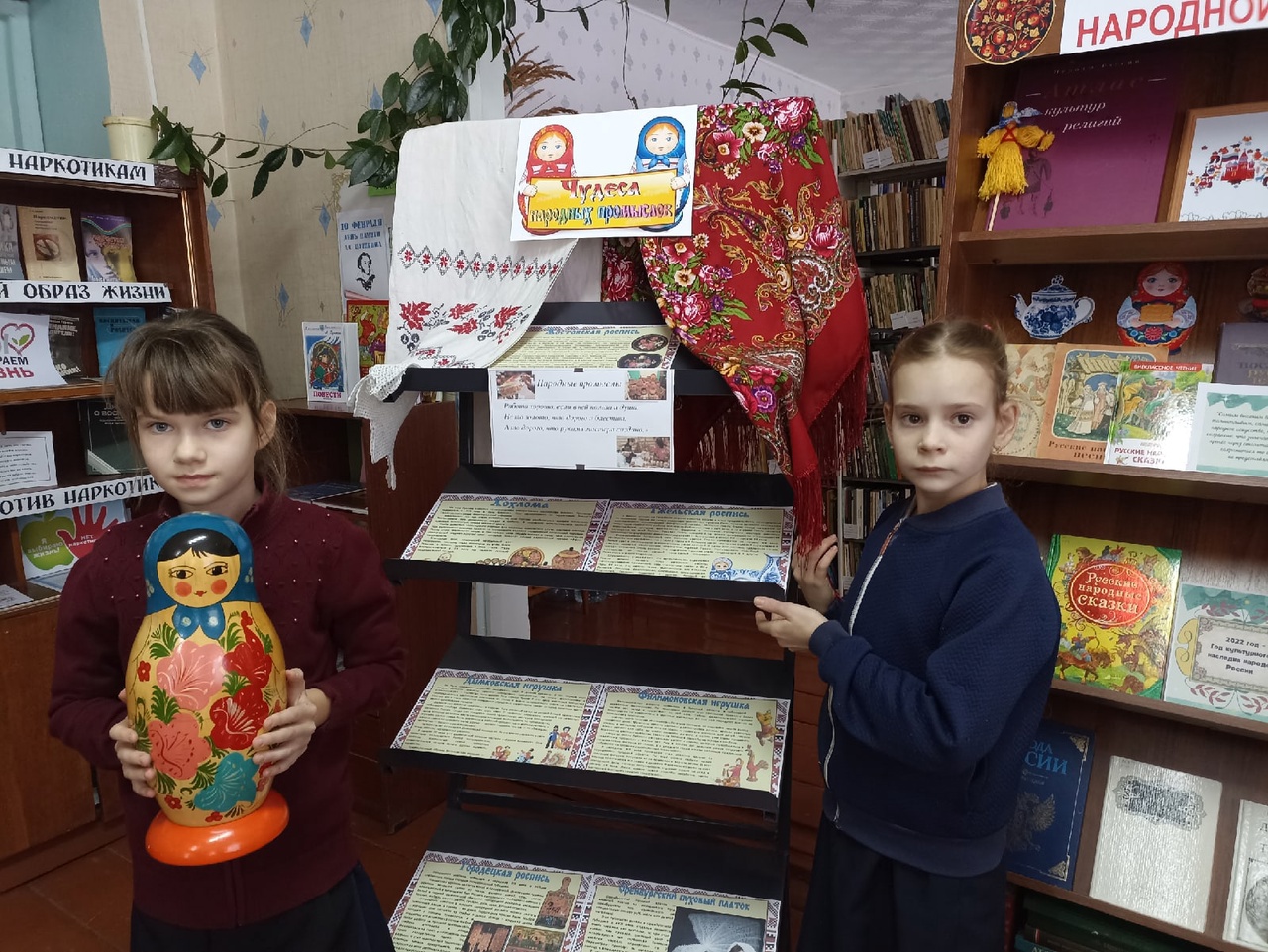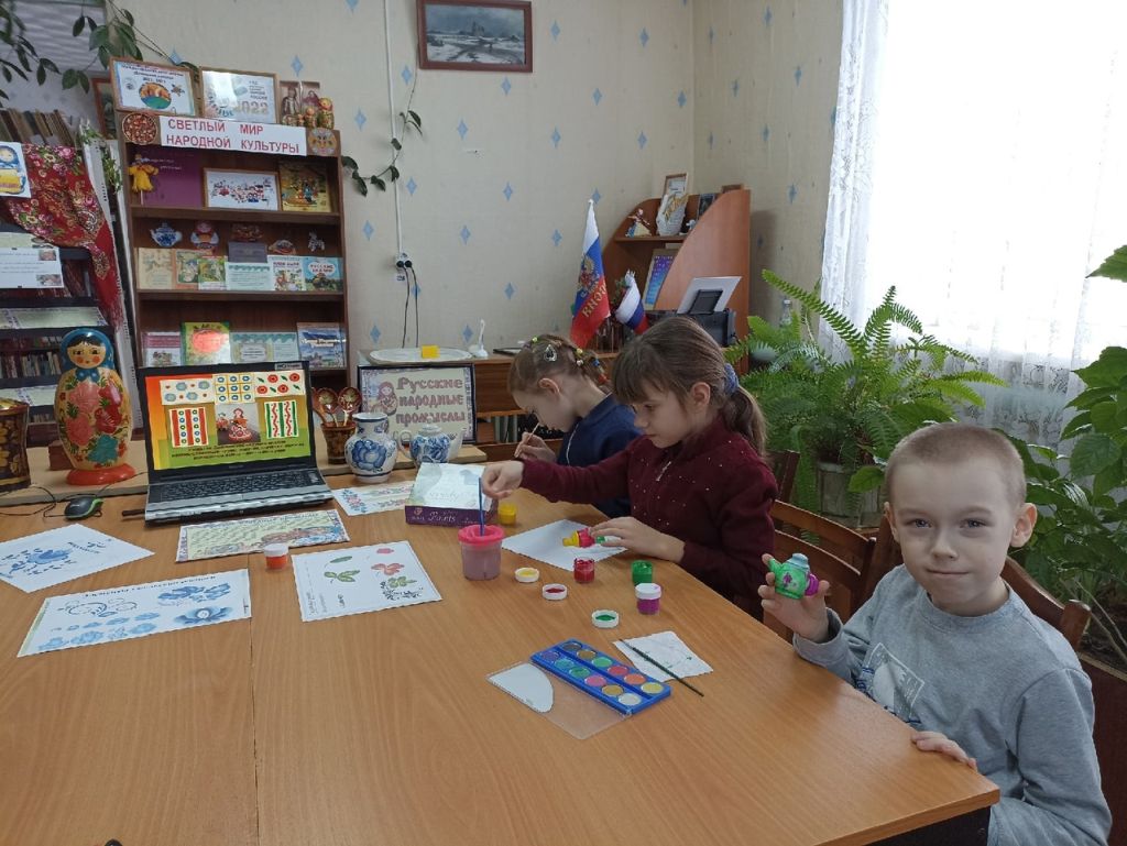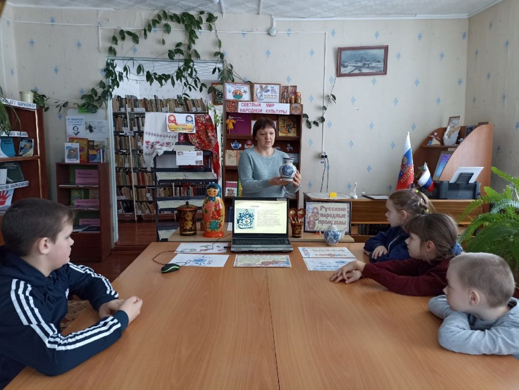 В рамках Года народного искусства и нематериального культурного наследия народов России в Четырчинской сельской библиотеке — филиале №29 состоялось интерактивное путешествие в мир народных промыслов. Учащиеся начальных и средних классов были приглашены на познавательный час «Многообразие русских народных промыслов». Во время мероприятия школьники совершили путешествие по самым известным своим мастерством уголкам России. Красочная презентация познакомила ребят с народными промыслами: Дымковская и Филимоновская игрушки, Городецкая и Жостовская росписи, Гжель и Хохлома и другими. Дети узнали, как зарождалось каждое ремесло и как удалось его сохранить до наших дней. Также интересно было узнать историю появления русской народной деревянной игрушки Матрешки. К мероприятию оформлена выставка-экспозиция «Чудеса народных промыслов», на которой помимо наглядной информации экспонировались предметы художественных народных промыслов – это кувшины, матрёшки, платки, фарфор, деревянные игрушки, ложки. Ребята попробовали себя в роли художников и расписали самовары и чашки (игрушки-магниты). Данное мероприятие позволило подрастающему поколению прикоснуться к истокам родной культуры и расширить представление о культурном наследии русского народа.