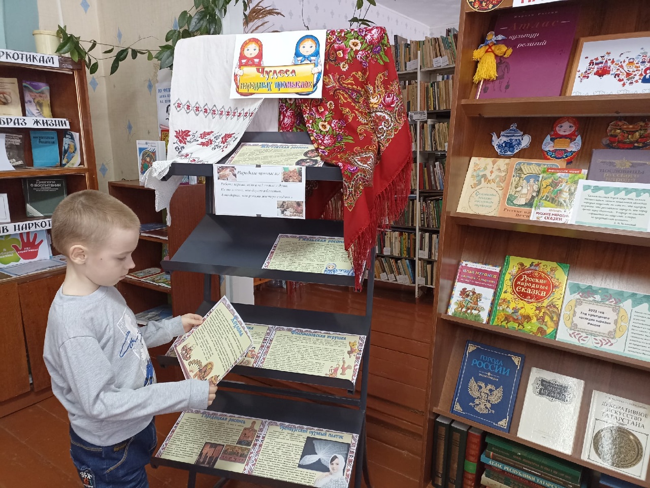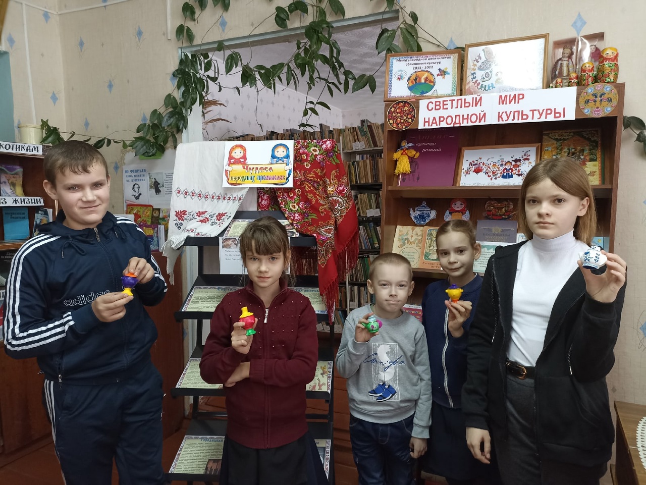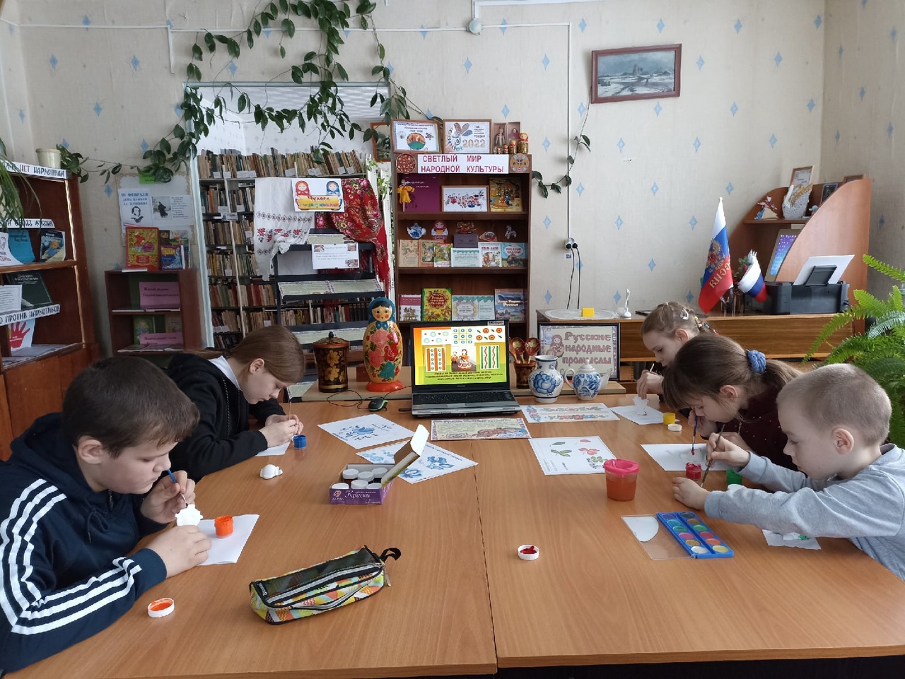 В рамках Года народного искусства и нематериального культурного наследия народов России в Четырчинской сельской библиотеке — филиале №29 состоялось интерактивное путешествие в мир народных промыслов. Учащиеся начальных и средних классов были приглашены на познавательный час «Многообразие русских народных промыслов». Во время мероприятия школьники совершили путешествие по самым известным своим мастерством уголкам России. Красочная презентация познакомила ребят с народными промыслами: Дымковская и Филимоновская игрушки, Городецкая и Жостовская росписи, Гжель и Хохлома и другими. Дети узнали, как зарождалось каждое ремесло и как удалось его сохранить до наших дней. Также интересно было узнать историю появления русской народной деревянной игрушки Матрешки. К мероприятию оформлена выставка-экспозиция «Чудеса народных промыслов», на которой помимо наглядной информации экспонировались предметы художественных народных промыслов – это кувшины, матрёшки, платки, фарфор, деревянные игрушки, ложки. Ребята попробовали себя в роли художников и расписали самовары и чашки (игрушки-магниты). Данное мероприятие позволило подрастающему поколению прикоснуться к истокам родной культуры и расширить представление о культурном наследии русского народа.