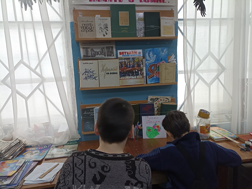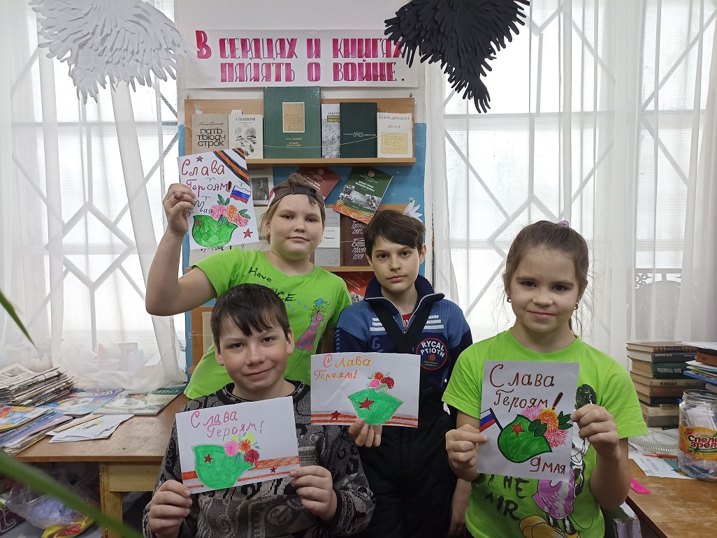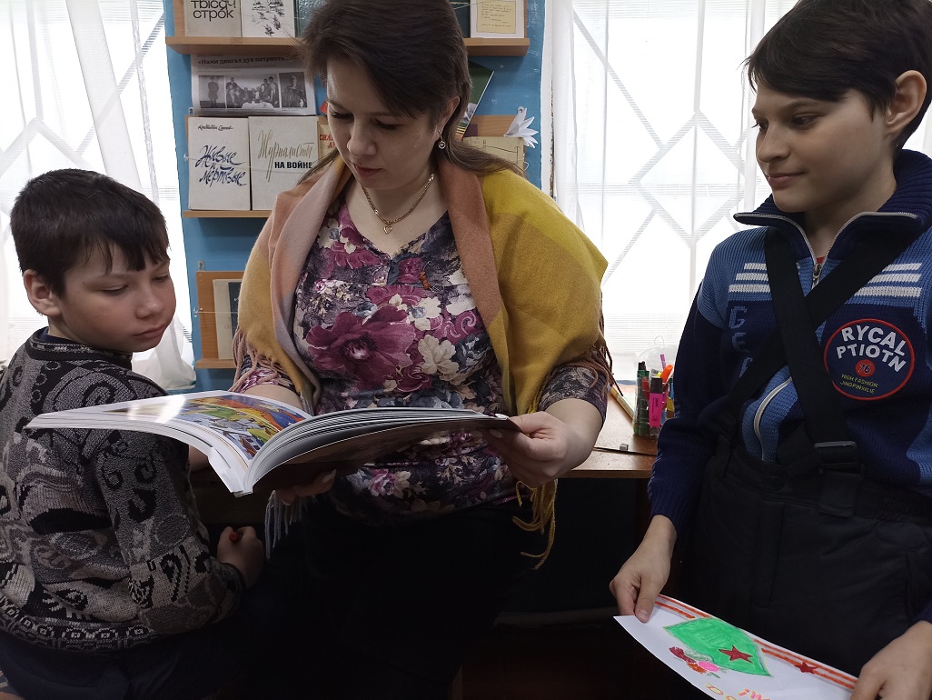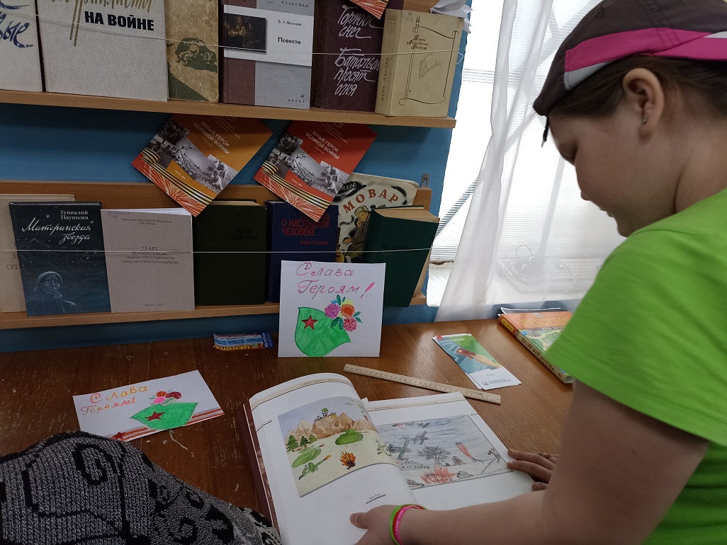 С помощью изобразительного искусства можно познакомить детей с произведениями искусства, отражающими события военных лет, расширить знания о Великой Отечественной войне, о её защитниках и героях и развить творческие способности. Важно воспитывать гордость за подвиг советского народа, желание беречь мир, а также прививать чувство патриотизма и любви к Родине, уважение к её истории. В преддверии праздника в библиотеке читатели познакомились с книжной выставкой «В сердцах и книгах память о войне», прочитали стихи Ю. Друниной. На выставке были представлены рисунки и отрывки из сочинений детей – участников конкурса детского творчества «Дети войны» из книги «А были вместе-детство и война…» . Война – страшное, жестокое слово, когда его слышишь, слезы текут и в голове возникают образы из фильмов, из рассказов ветеранов о том, как сражались герои за наше мирное небо. Герои Победы – это юные мальчики, сбежавшие на фронт, чтобы сражаться за будущее своей страны, это молоденькие девушки-медсестры, которые выносили раненных с полей боя, это солдаты, готовые биться до последней капли крови за Родину, это женщины, которым пришлось учиться воевать наравне с мужчинами, женщины, которым пришлось осваивать мужские профессии, чтобы прокормить и обеспечить фронт всем необходимым, старики, которые трудились не покладая рук, дети, у которых не было полноценного детства и матери, жены, которые годы ждали своих сыновей и мужей. Все они – Герои Победы – наши деды, прадеды, бабушки и прабабушки, на долю которых выпала страшная и долгая война. Мы должны помнить и чтить их подвиги, ведь они положили миллионы жизней, чтобы мы с вами могли жить в свободной стране, чтобы у нас было будущее, которое мы сами можем выбирать, чтобы был мир во всем мире, чтобы не было войны.