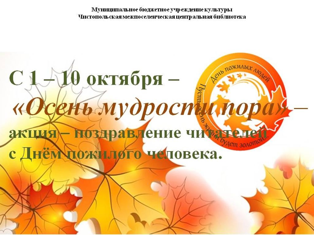 С 1 по 10 октября в Центральной библиотеке проходит акция — поздравление читателей с Днем пожилого человека «Осень мудрости пора». Участникам акции вручили небольшие сладкие подарки и красочные поздравительные открытки с теплыми пожеланиями здоровья и долголетия. Из уст сотрудников библиотеки прозвучали слова благодарности пожилым читателям за их огромный жизненный опыт, доброту и верность библиотеке.