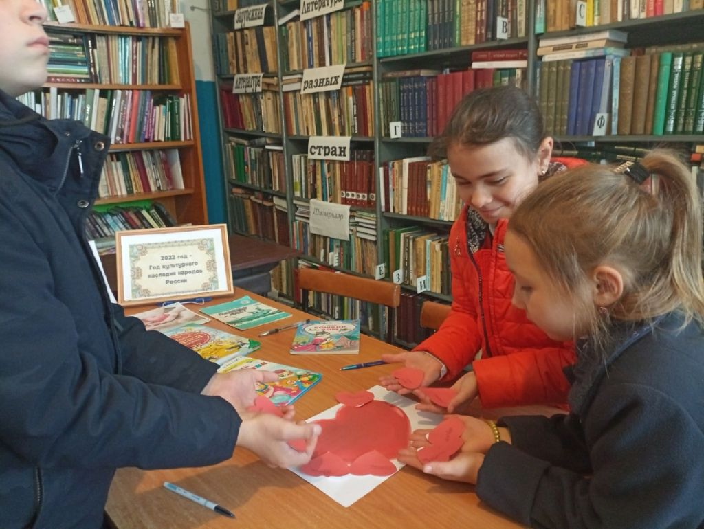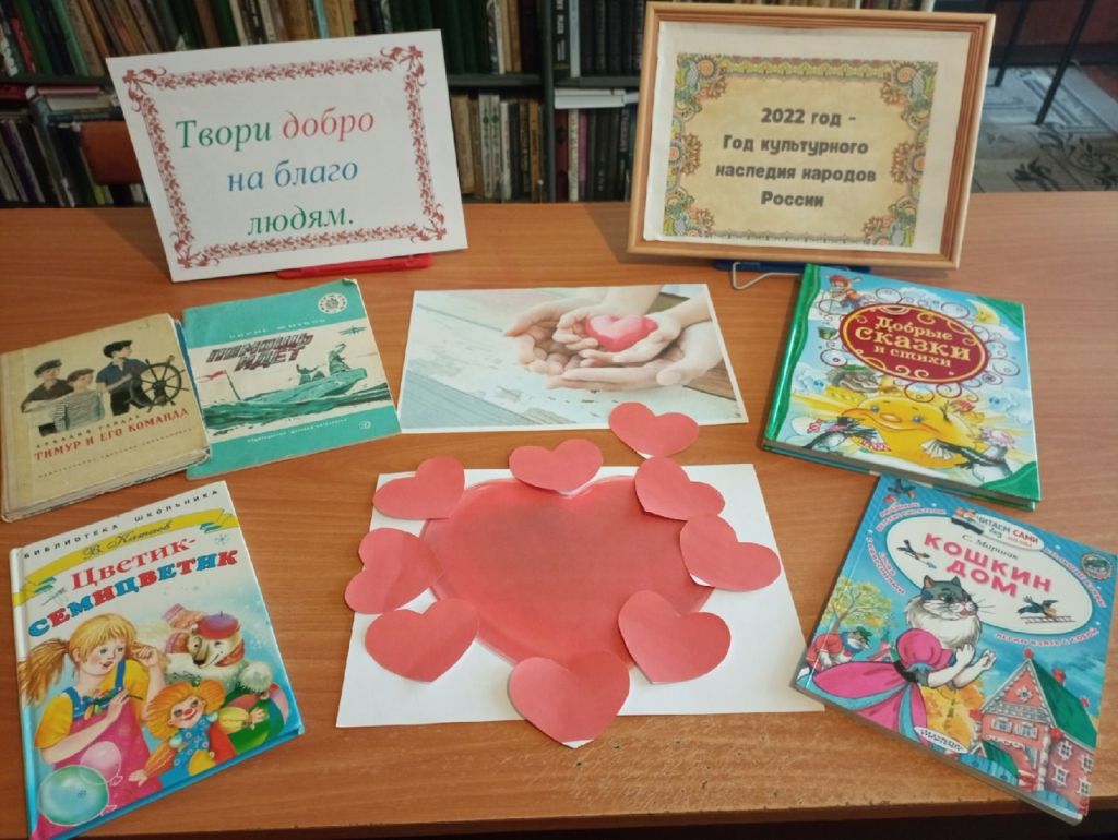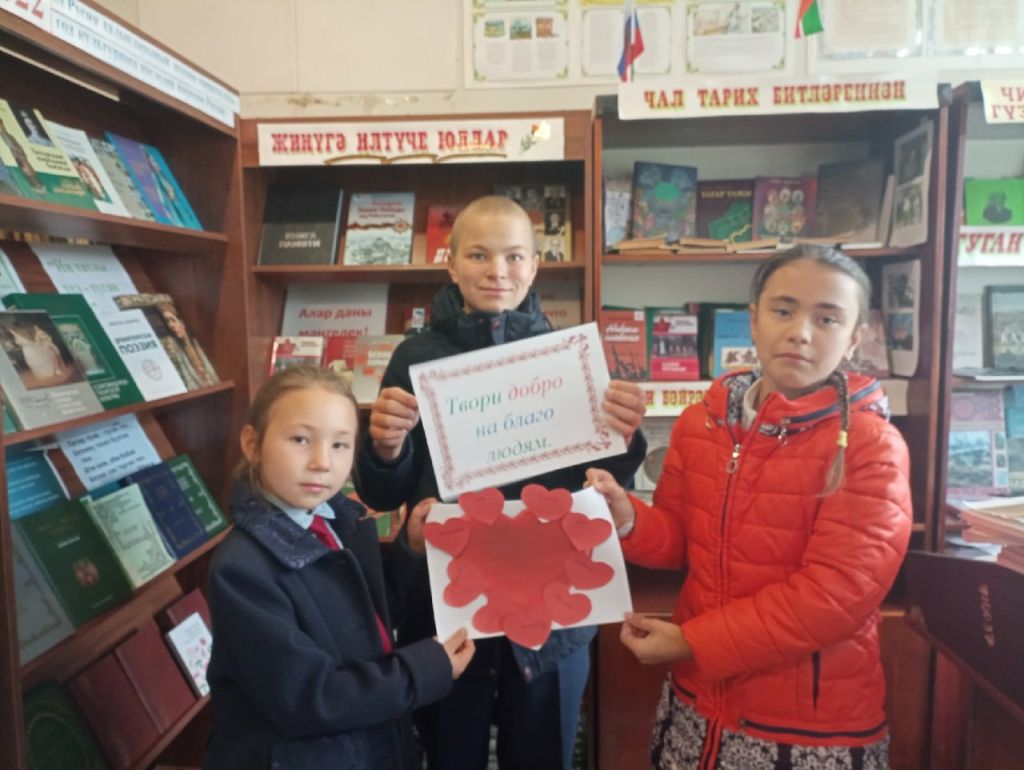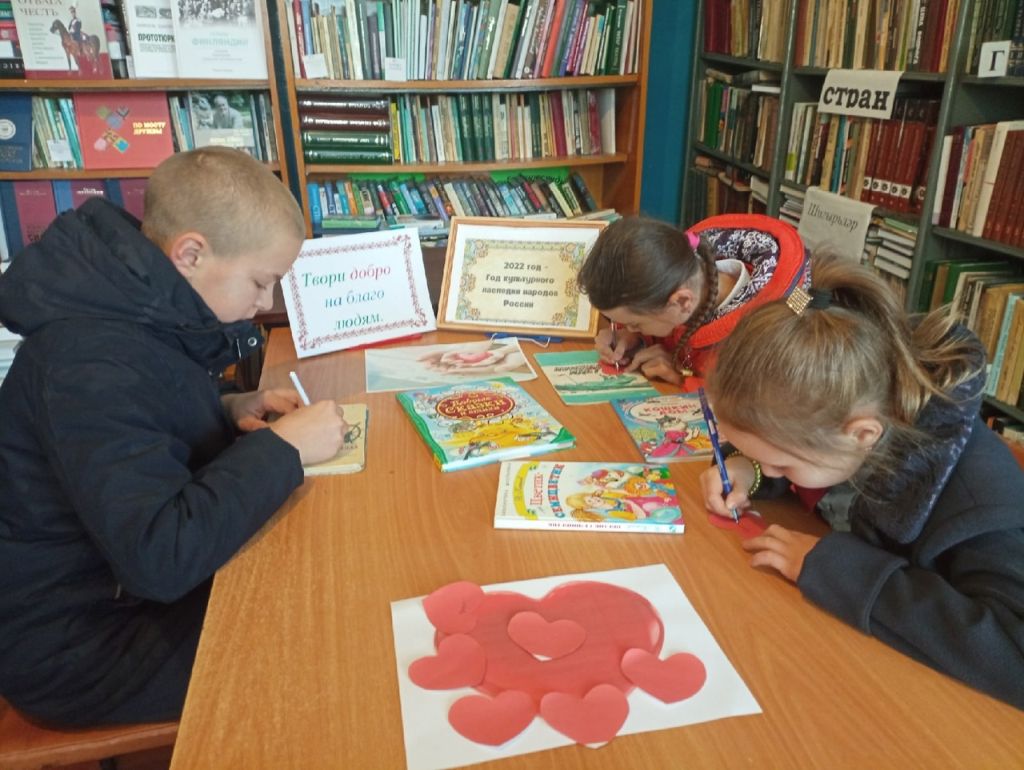 С 1 октября по 10 октября проходит декада пожилых людей. В Исляйкинской сельской библиотеке был проведен информационный час «Твори добро на благо людям». Ребята узнали, что Неделя доброты проводится не для того, чтобы побыть добрым, а потом забыть, а для того, чтобы именно сейчас обратить особое внимание на понимание доброты, добрых поступков, вежливых слов. Чтобы именно сейчас посмотреть на себя и понять, добрый ли ты человек. На вопрос: «Кто считает себя добрым?» ребята задумались, не все подняли руку, как бы прислушались к себе, потому что сразу хочется спросить – как проявляется твоя доброта? Ведь невозможно быть просто добрым, ничего не делая. А что доброго дети делают? Ребята ознакомились с добрыми делами своих сверстников. Примеры приводились из произведения А.Гайдара «Тимур и его команда», С.Маршака «Кошкин дом», Б.Житкова «Помощь идет». На нарисованной бумаге большому сердцу ребята приклеили маленьких сердечек, где написали добрые слова, которые они сделали сегодня или вчера. Ребята решили, что доброта идет из сердца. Закрыв глаза, дети прислушались к своему сердцу, чтобы, как предлагал плакат «Поделись своей добротой», поделиться ею с соседями, друзьями.