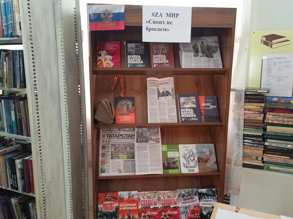 Методист Тат.Сарсазской сельской библиотеки среди жителей села провела патриотическою акцию «Своих не бросаем» в поддержку военнослужащих, выполняющих задачи в ходе специальной военной операции на территории Украины. Мы должны поддержать подвиг российских солдат по освобождению населенных пунктов ЛНР и ДНР, жители, которых после долгих дней в укрытиях и подвалах выходят на улицу, встречают российских солдат и получают гуманитарную помощь. Так же в библиотеке оформлена книжная выставка, посвященная биографии и жизни выдающихся военных деятелей, героев России. Читатели библиотеки могут сделать памятную фотографию на фоне выставки для социальных сетей с хэштегами:
