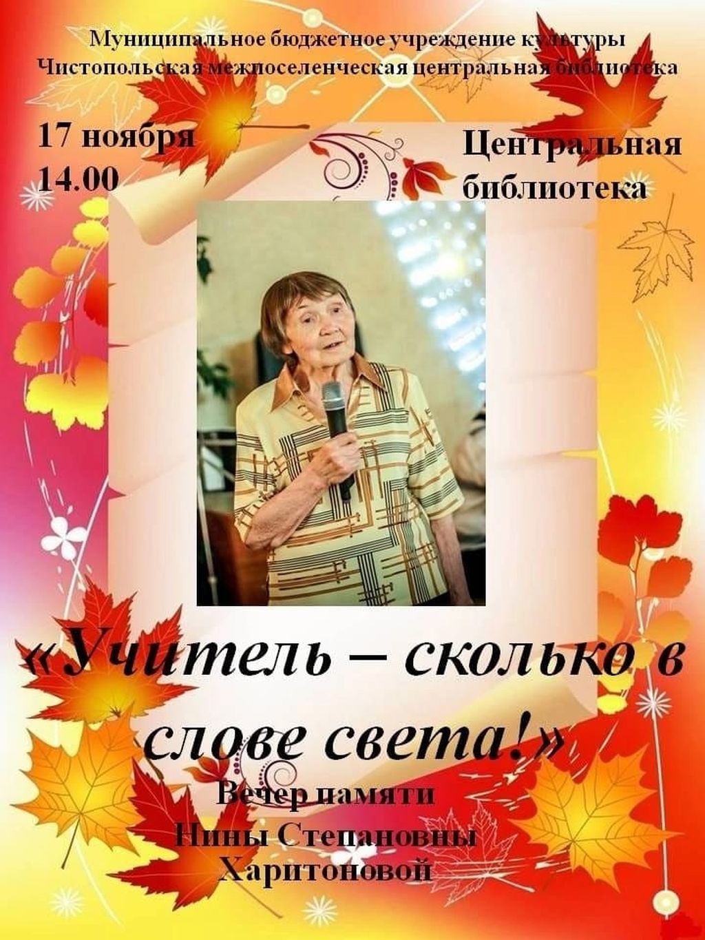 17 ноября 2022 года исполнилось бы 94 года со дня рождения заслуженного педагога РТ, известного в городе учителя – краеведа, Почётного гражданина города Нины Степановны Харитоновой. В Читальном зале Центральной библиотеки на вечер памяти «Учитель – сколько в слове света!» собрались все те, кто из года в год сохраняют память об учителе с большой буквы: члены литературного объединения «Ступени», работники музеев и библиотек, творческая интеллигенция города, ученики Нины Степановны. В ходе вечера выступали, читали интересные материалы из книги «По вечерам в её окне горел огонь», новые посвящения, вспоминали интересные истории о педагоге: Мира Максимова, Наталья Пасмурова, Наталья Курнавенкова, Дмитрий Забегаев, Рашид Шигабутдинов, Валентина Солдатова, Лилия Валеева, Елена Быкова, Альмира Шарифуллина/