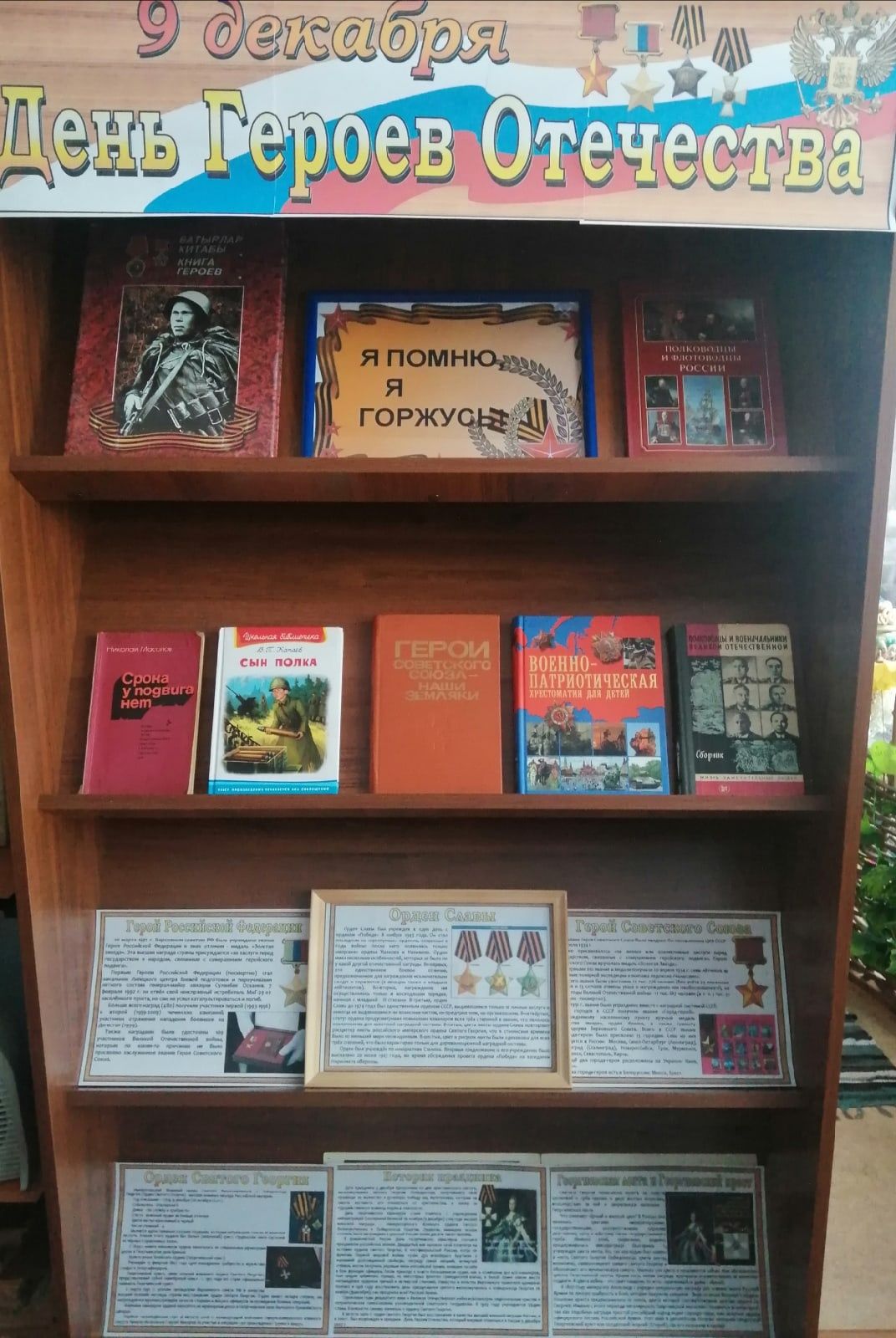 К этому событию в библиотеке оформлена книжная — информационная выставка на которой представлена информация об истории праздника, о Героях Отечества разных времен, о наградах, которые присваивались за заслуги перед Отечеством, а также художественная и документальная литература, которая расскажет о славных подвигах, сражениях, о судьбах легендарных героев — полководцев, солдат разных эпох и времен, защищавших нашу страну.