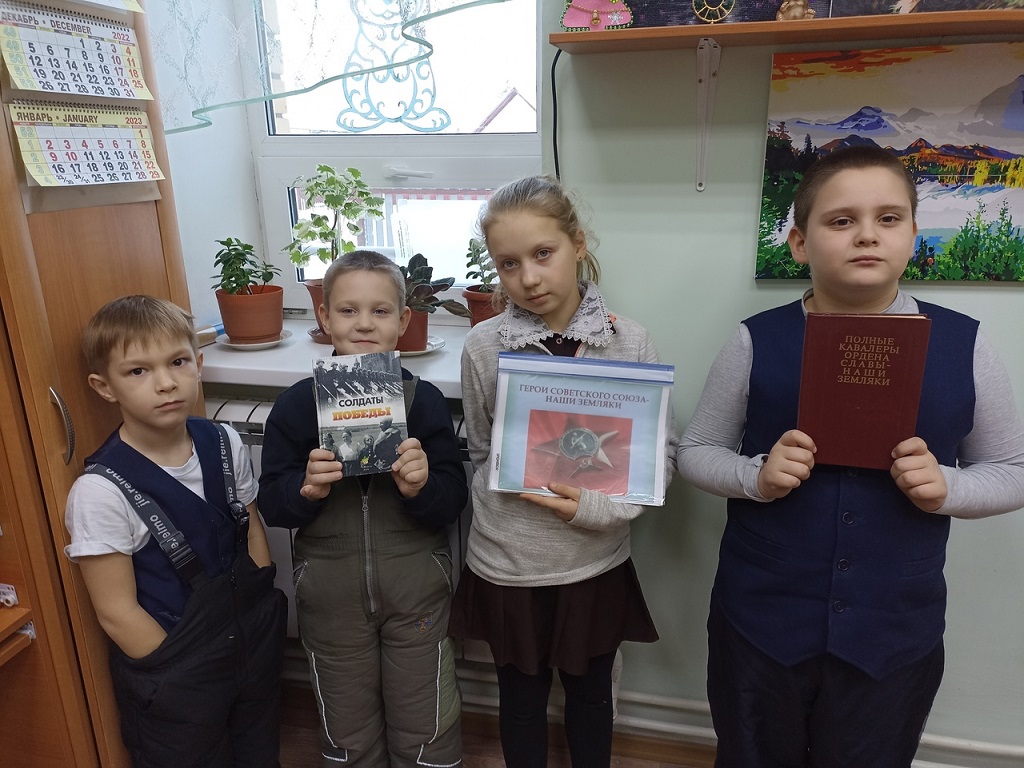 Ребята ознакомились с краткой историей праздника, с историческими событиями. Узнали о героях — земляках, которые совершили боевые подвиги в Великую Отечественную, Афганскую, Чеченскую войнах и были удостоены высоких наград. А так же о героях нашего времени – участниках СВО. Посмотрели информационный видеоролик, изучили тематическую литературу.