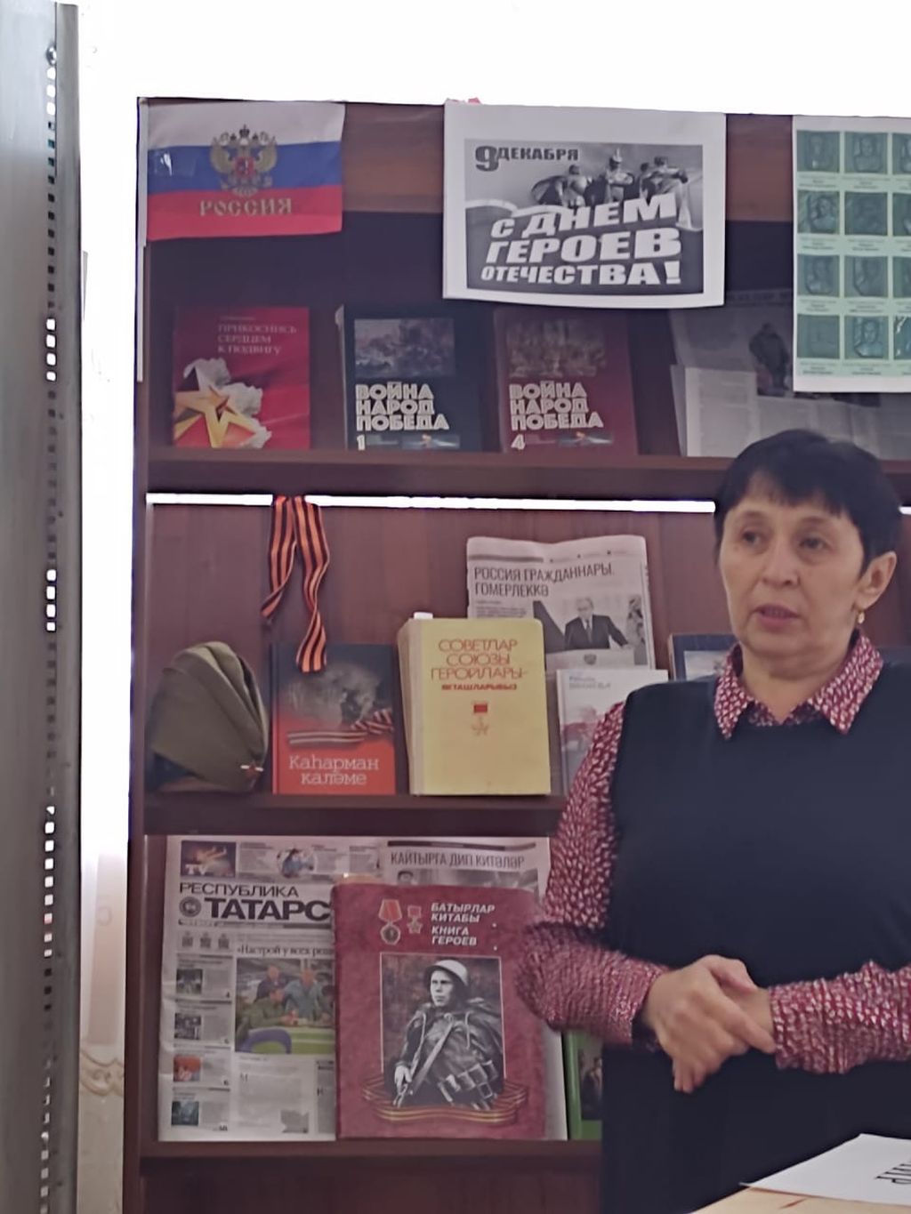 В честь дня Героев Отечества в Тат.Сарсазской сельской библиотеке для учащихся 6-7 классов провели патриотический час «Героев помним имена», где методист рассказала о возникновении этого праздника, о наградах Героям Отечества, о Героях Отечества разных времен, которые присваивались за заслуги перед Отечеством. Ребята с большим интересом слушали о героях- земляках, которые совершали боевые подвиги в Великую Отечественную, Афганскую, Чеченскую войнах и были удостоены высоких наград. Так же познакомила с книжной выставкой.