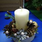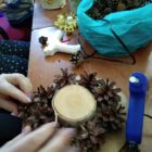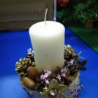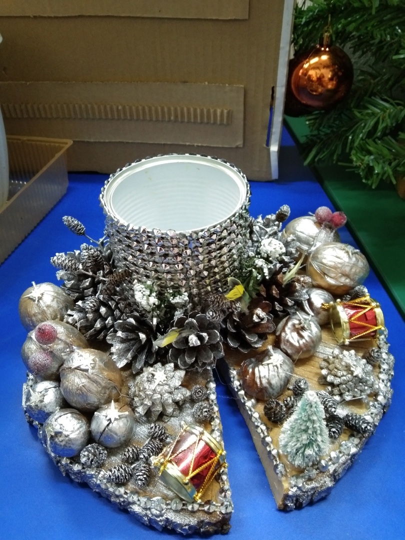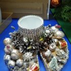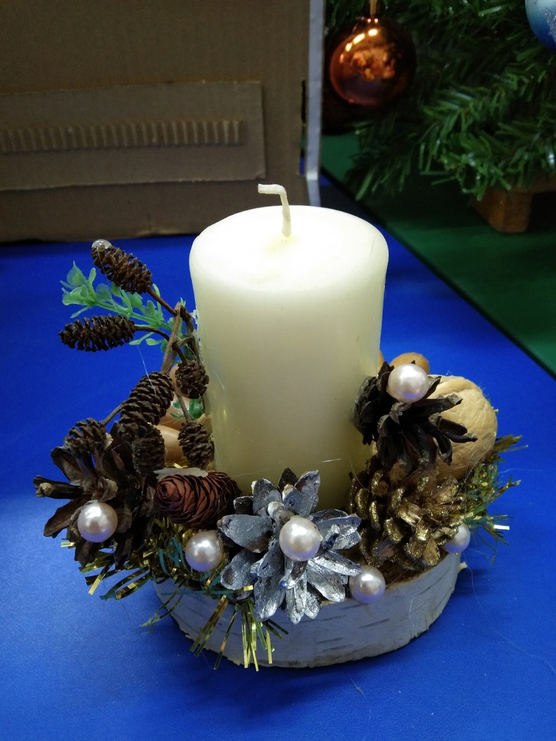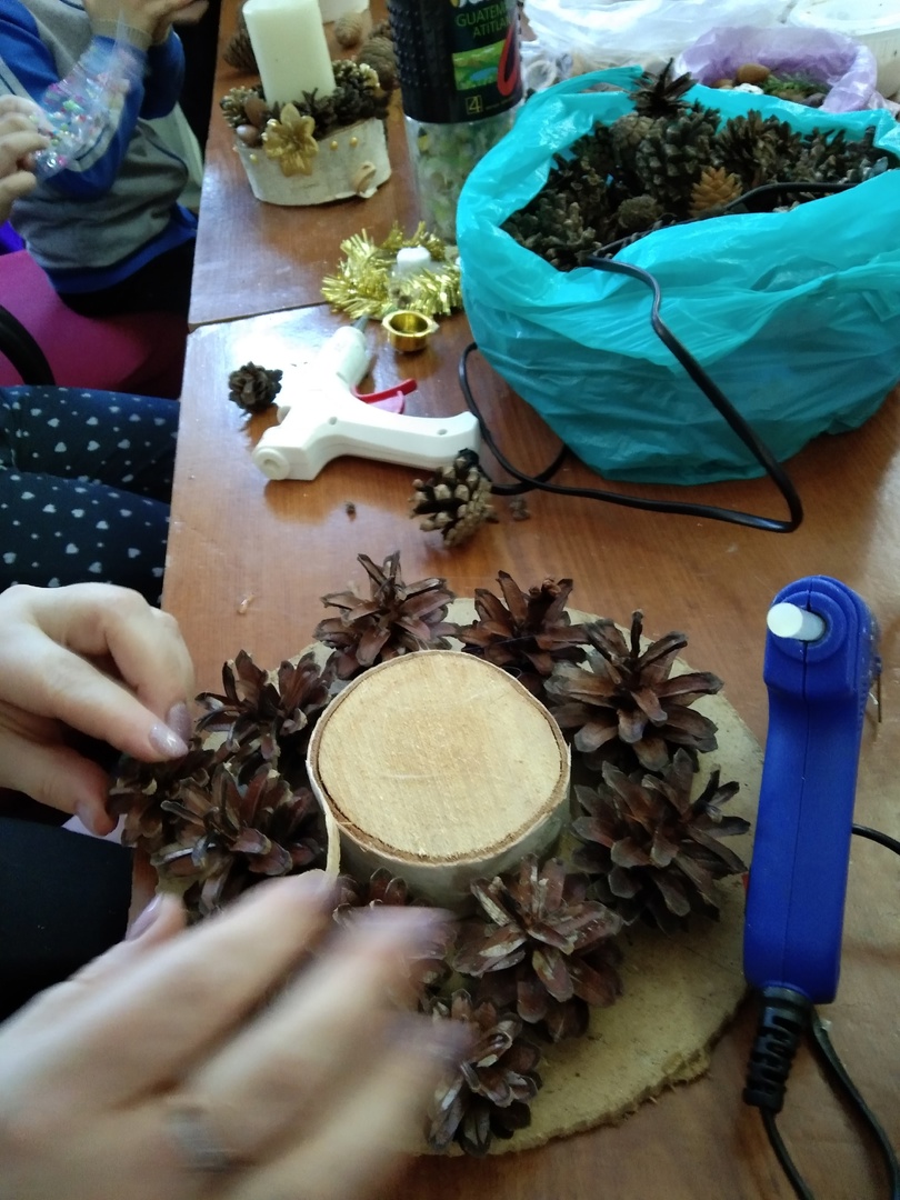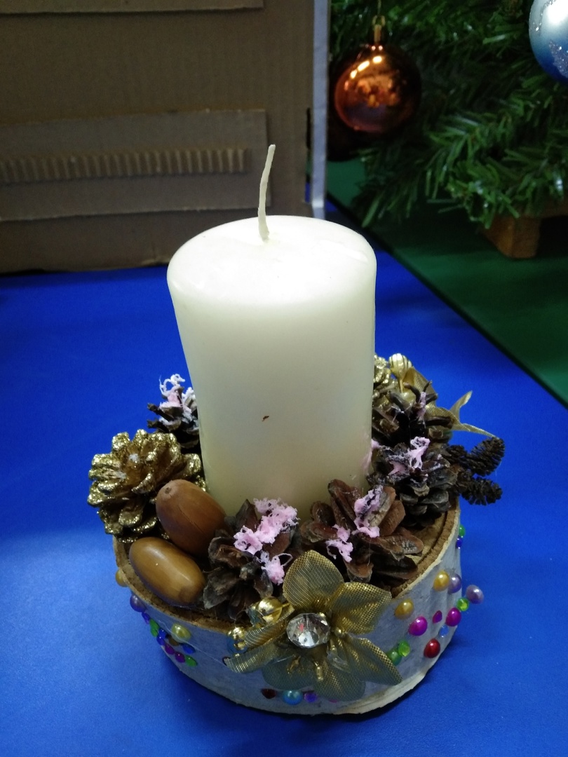 Новогодние подсвечники у всех получились разные. В работе были использованы деревянные спилы, шишки от хвойных деревьев, скорлупки от грецких орехов, бусы, стразы, декоративные ленты, веточки деревьев – рябины, ольхи, ивы и груши. Все детали к основе приклеивались с помощью клея – пистолета.