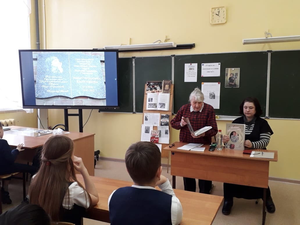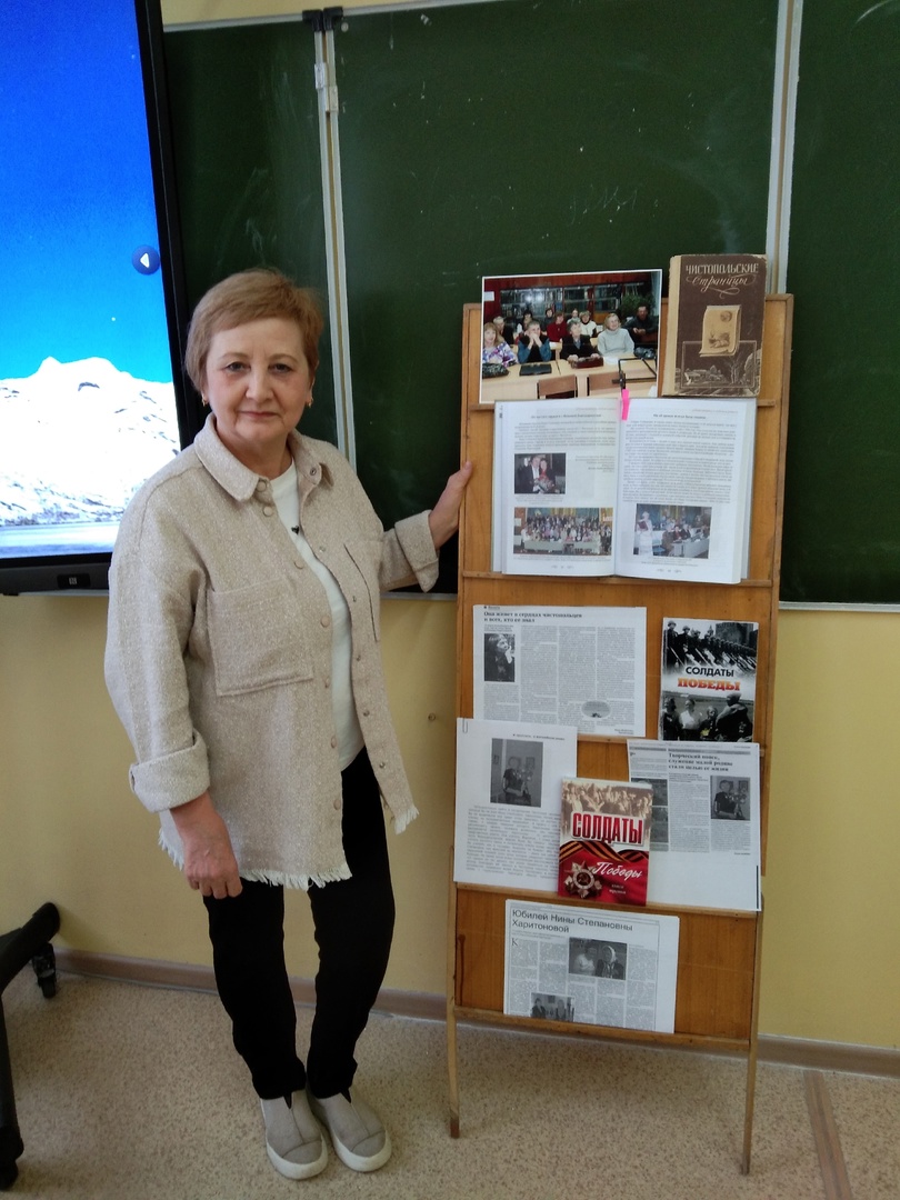 Для школьников члены литературного объединения «Ступени» и методист библиотеки подготовили презентацию книги «По вечерам в её окне горел огонь» — о заслуженном учителе ТАССР, Почетном гражданине города Чистополь, выдающимся краеведе, лауреате литературной премии имени Кояш Тимбиковой Нине Степановне Харитоновой. Нина Степановна педагог с большим стажем, активно вела переписку с писателями, находившимися в годы Великой Отечественной войны в Чистополе. Она, соавтор книги «Чистопольские страницы», Нина Степановна инициировала создание музея Бориса Пастернака, была идейным вдохновителем и создателем первых книг «Солдаты Победы». В течение нескольких лет шла работа по сбору необходимого материала для книги о знаменитом краеведе. Собирала материалы (статьи разных авторов и самой Нины Степановны, фотографии разных лет, поэтические произведения), и составляла сборник – член лито «Ступени» Валентина Солдатова. Книга была издана большим форматом в городе Казань, и стала отличным помощником в работе учителей и библиотекарей. Чистопольский автор, ветеран педагогического труда Максимова Мира Ивановна рассказала о своей дружбе со знаменитым краеведом, об издании первых трёх книг «Солдаты Победы». Методист библиотеки прочитала из сборника лучшие стихи и рассказы. Книжную выставку к мероприятию подготовил школьный библиотекарь.