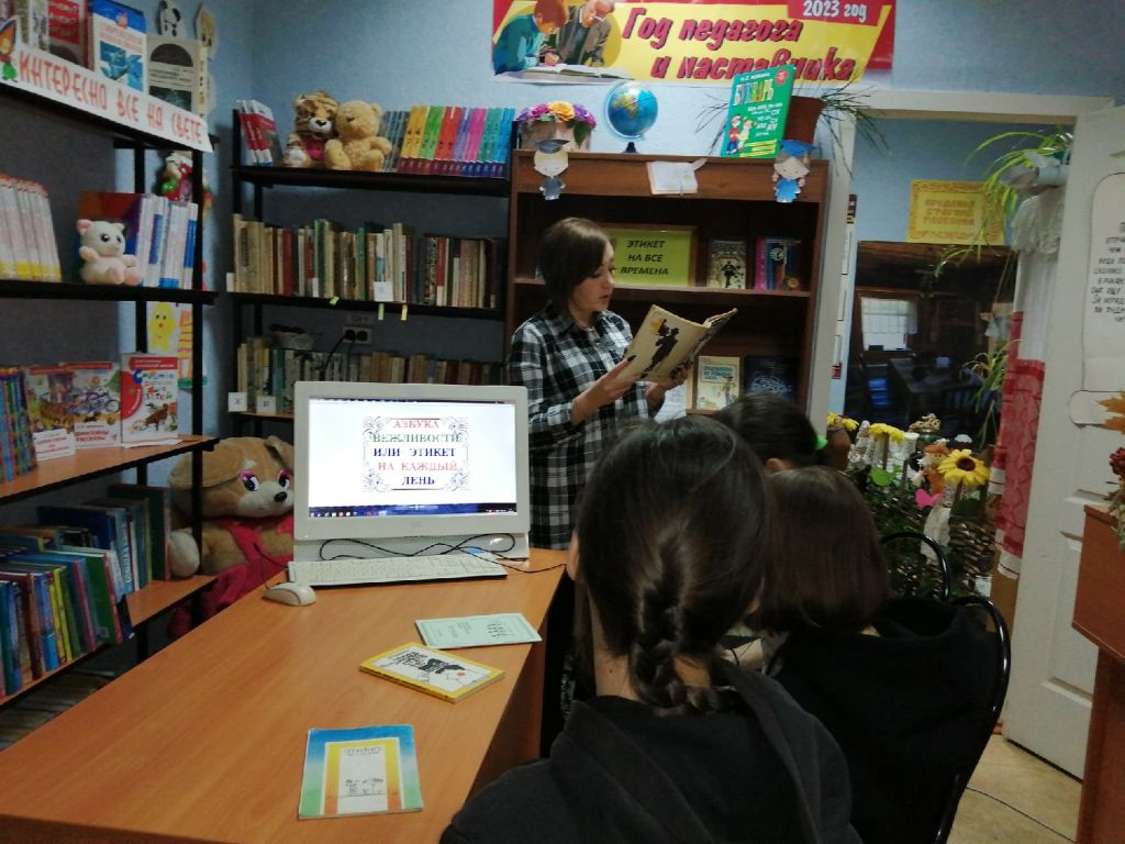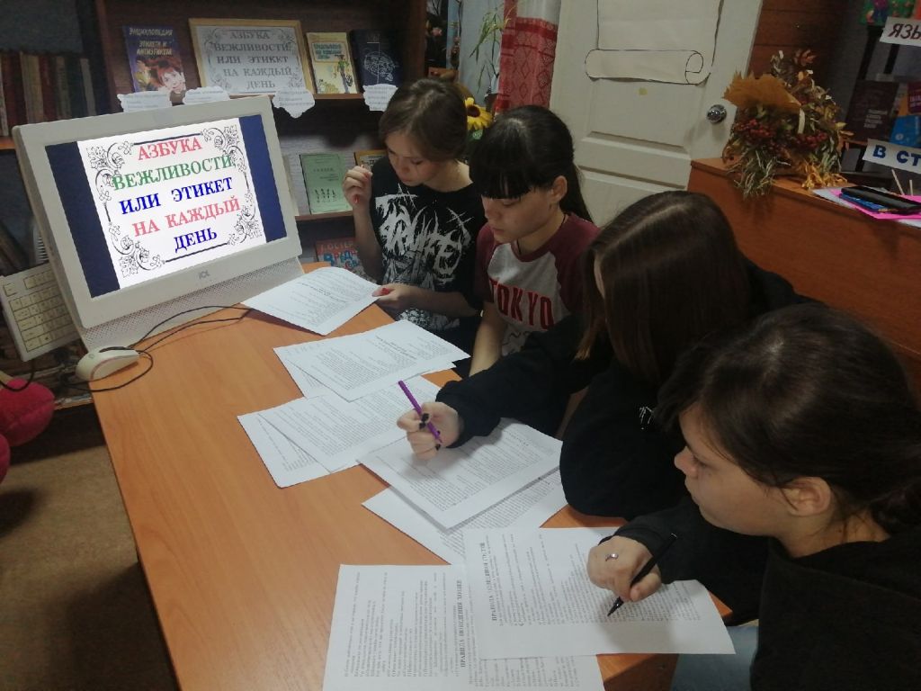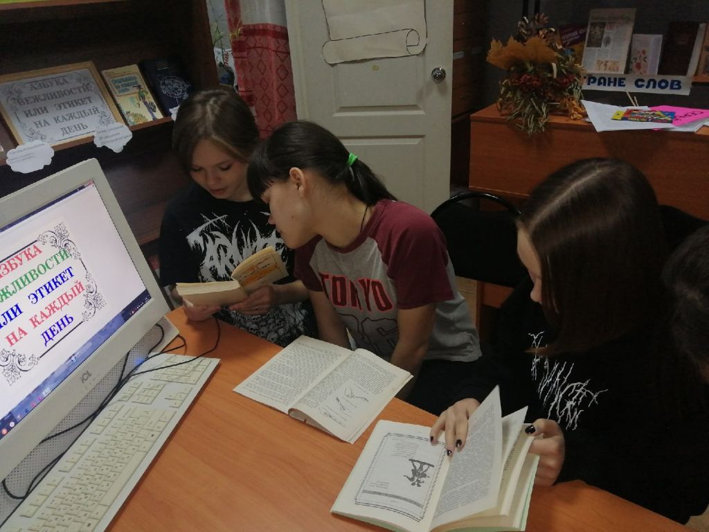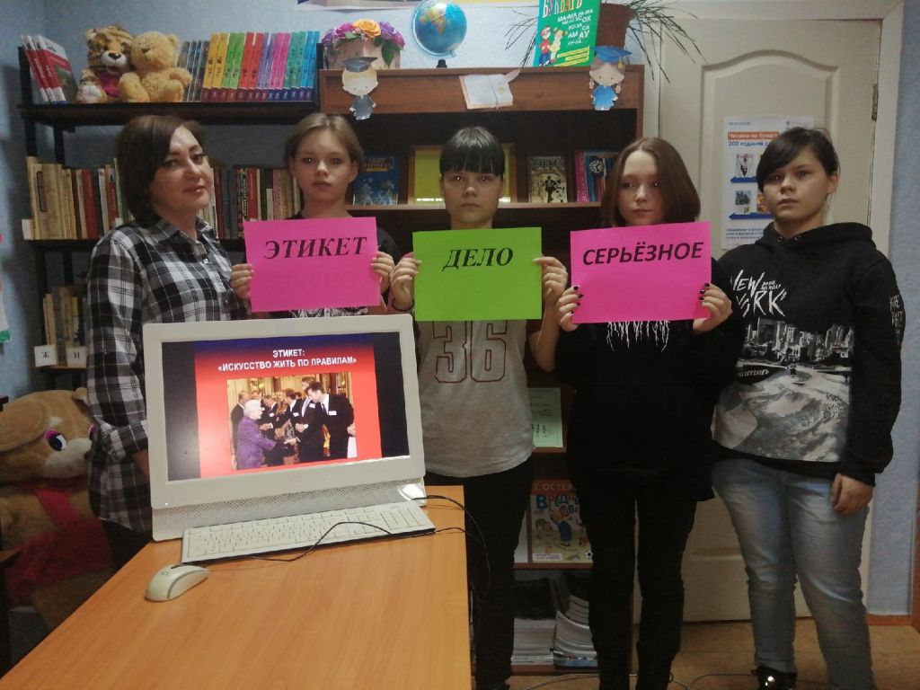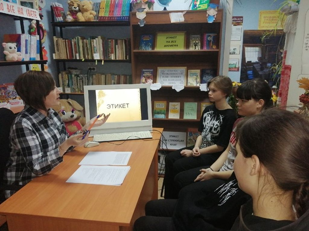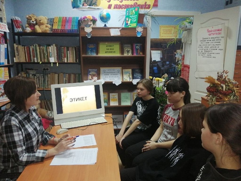 В библиотеке для учащихся школы был проведён информационный час «Этикет дело серьёзное». Библиотекарь дала информацию об истории возникновения слова «этикет», напомнила, что человек, который знает все правила этикета и соблюдает их, называется культурным и воспитанным. Познакомила детей с основными требованиями этикета. Рассказала, что этикет бывает: речевой, общественный и столовый. С детьми была проведена викторина с вопросами, связанными с правилами поведения в транспорте, ресторане, при общении по телефону. Проведено тестирование где учащиеся смогли проверить себя на знания как правильно вести себя в разных ситуациях, как легче добиться успеха соблюдая этикет. В конце мероприятия подвели итог: хорошо воспитанные люди обязательно должны знать и соблюдать правила этикета ежедневно, ежечасно, везде. К мероприятию была оформлена книжная выставка «Этикет на все времена».