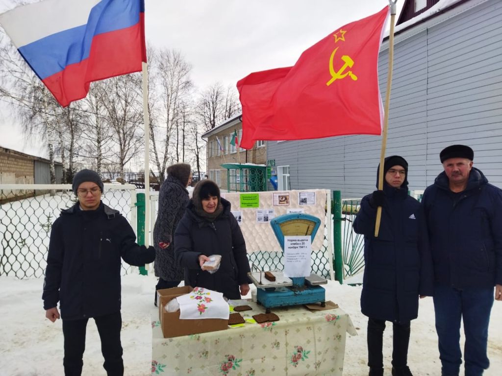 Учащимся и жителям села рассказали о подвиге и мужестве людей в то страшное время, как мужественно сражался осажденный город, о тяжелых испытаниях, выпавших на долю жителей города: о голоде и холоде, о детях и женщинах, работавших наравне с мужчинами, делая оружие и снаряды. Никого не оставил равнодушным рассказ о том, что с 1 июля в Ленинграде были введены карточки. А с 8 сентября – хлебная порция стала систематически снижаться. С 800 граммов порция упала до 200 граммов хлеба для рабочих и 125 граммов для всех остальных.