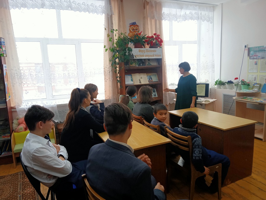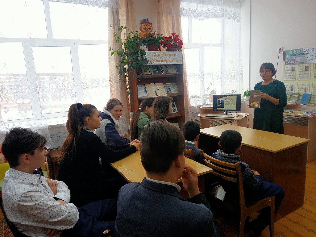 К 150-летию со дня рождения великого русского оперного и камерного певца, народного артиста РСФСР – Федора Шаляпина в Чувашско-Елтанской сельской библиотеке прошел информационный час «Страницы жизни Федора Шаляпина». В ходе мероприятия читатели узнали о сложном творческом пути, в ходе которого Федор Шаляпин из простого статиста превратился в певца мировой величины. Участники узнали также, что Федор Шаляпин хорошо писал маслом, рисовал и лепил, проявлял большие литературные способности. Затем прослушали отрывки из песен «Очи черные», «Вдоль по Питерской», посмотрели презентацию о Федоре Шаляпине. К юбилею великого певца Федора Шаляпина была оформлена тематическая выставка, где можно было узнать о многих интересных фактах жизни и творчества оперного артиста.