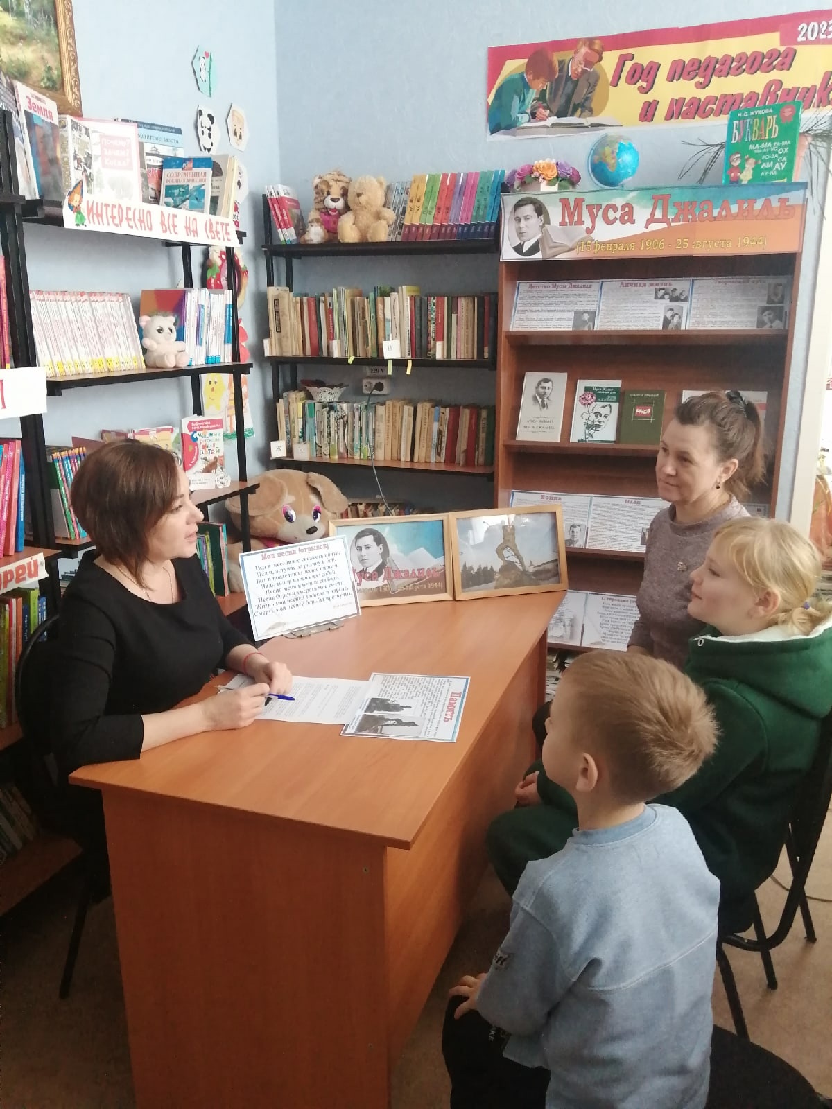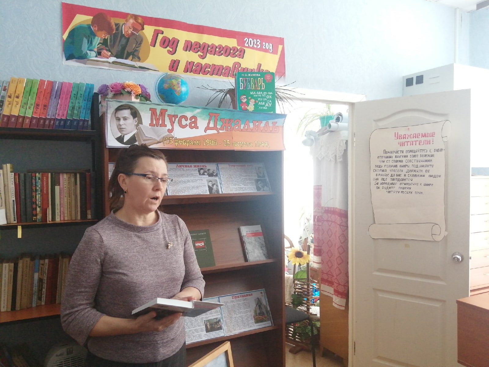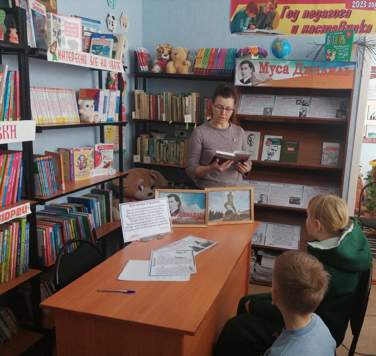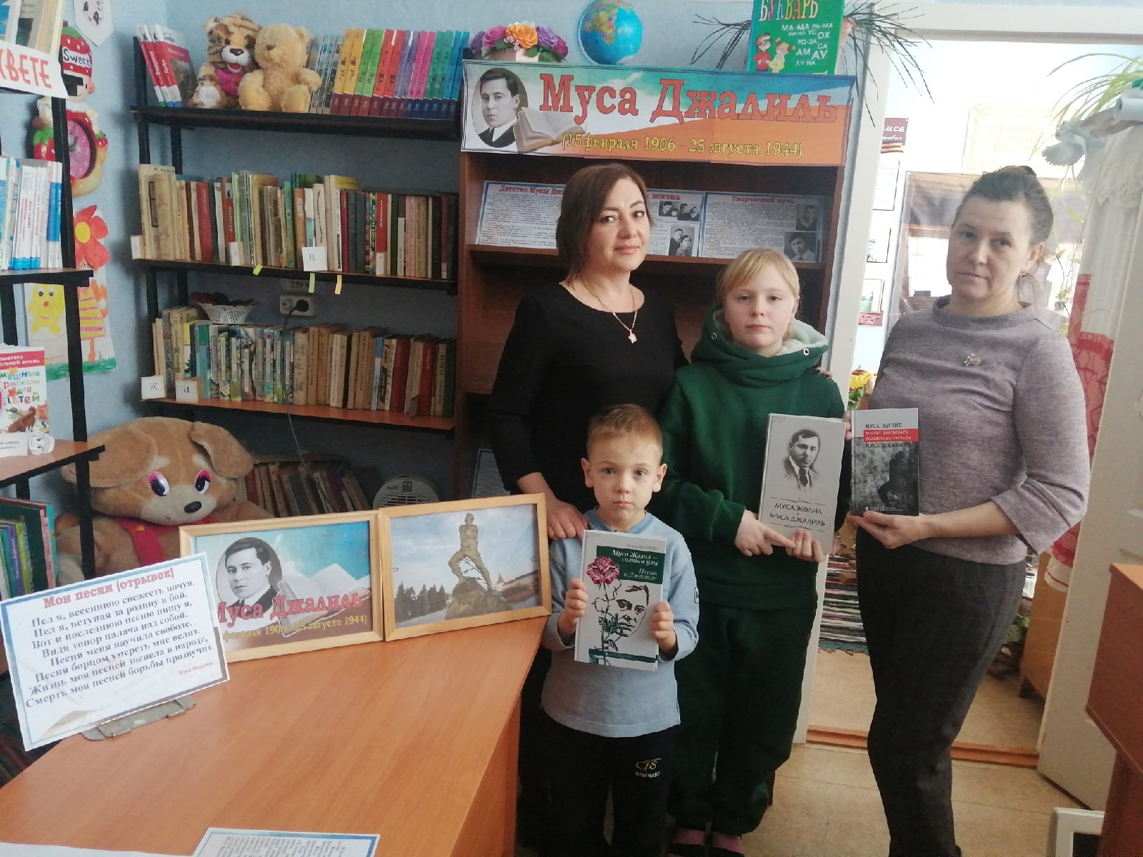 К 117-летию со дня рождения великого героя и поэта Мусы Джалиля в Малотолкишской сельской библиотеке был проведён час поэзии «Подвиг во имя народа». Библиотеку посетили учащиеся 1-4 классов и учитель татарского языка. Библиотекарь познакомила детей с биографией поэта — героя, который увековечил своё имя бессмертным литературным творением и военным подвигом. Ребята смогли больше узнать о жизни и творчестве поэта, начиная с самых первых его детских стихотворений. Учителем были зачитаны вслух стихи М. Джалиля на татарском языке «Кыз жыры», «Кичер, Илем!», «Кызыл ромашка». Библиотекарь зачитала стихи «Варварство», «Чулочки». К мероприятию была оформлена выставка на которой представлены произведения поэта и интересные факты из его биографии