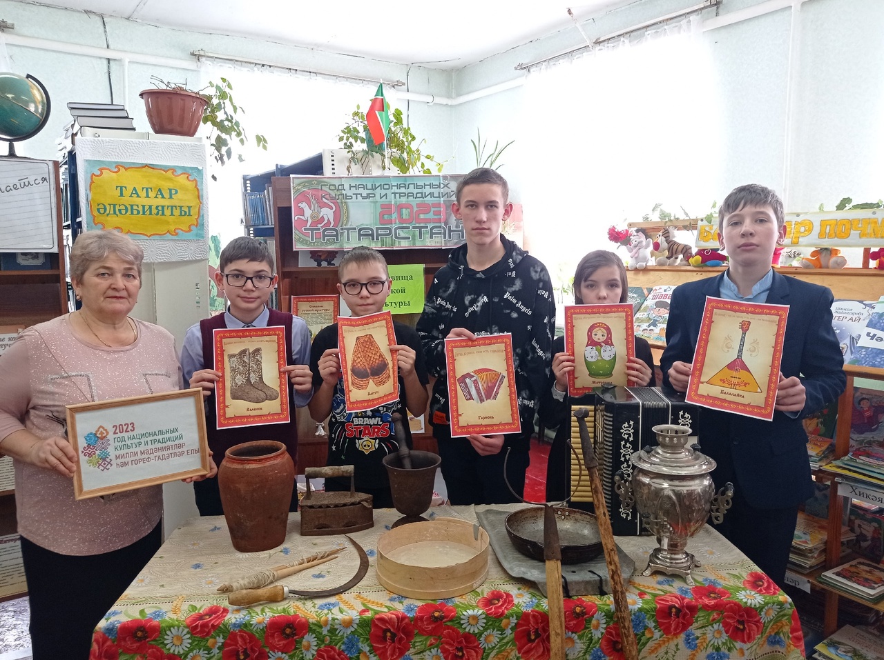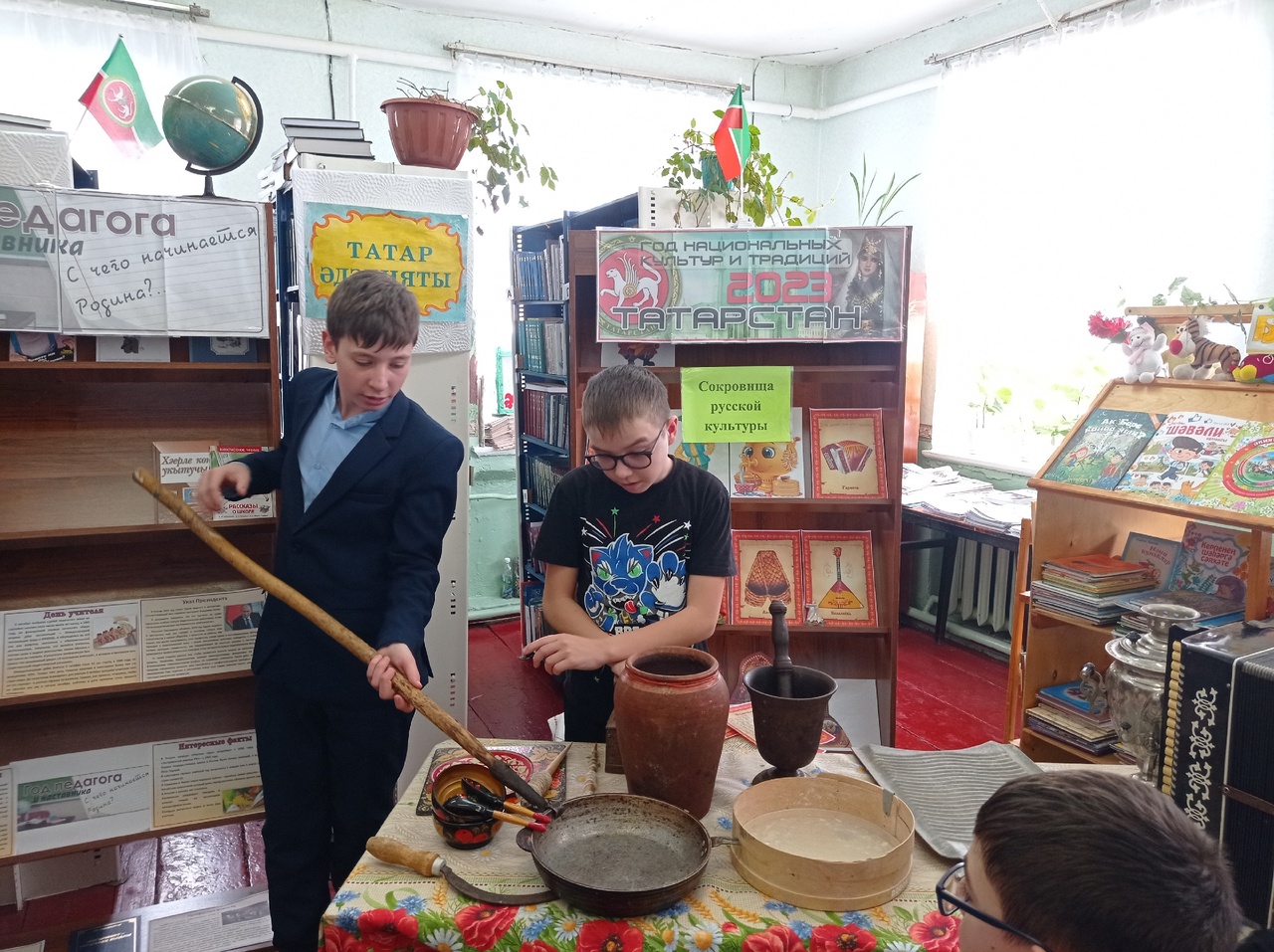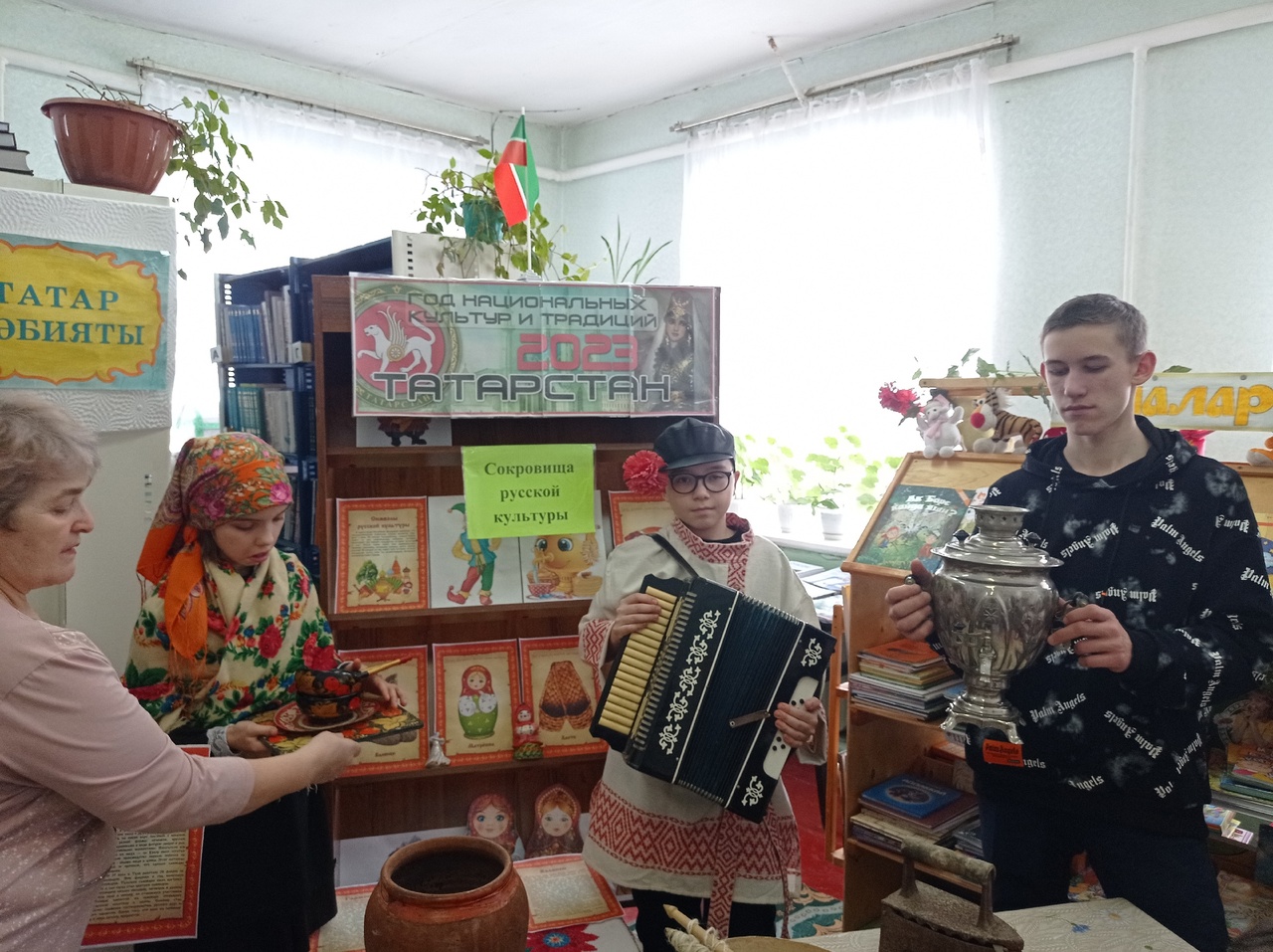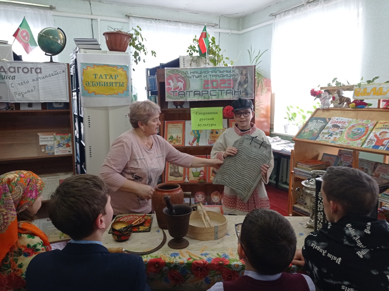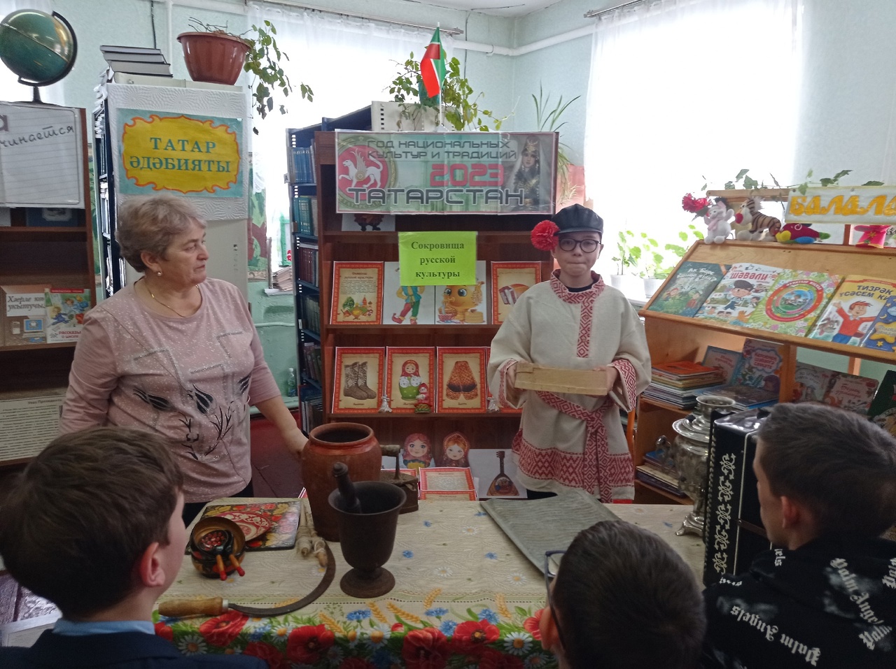 Продолжается месячник русской культуры.В Кзыл Яланской сельской библиотеке работает выставка под названием «Сокровища русской культуры», можно познакомится с символами русской культуры. Около этой выставки прошёл познавательный час «Предметы русского быта».
