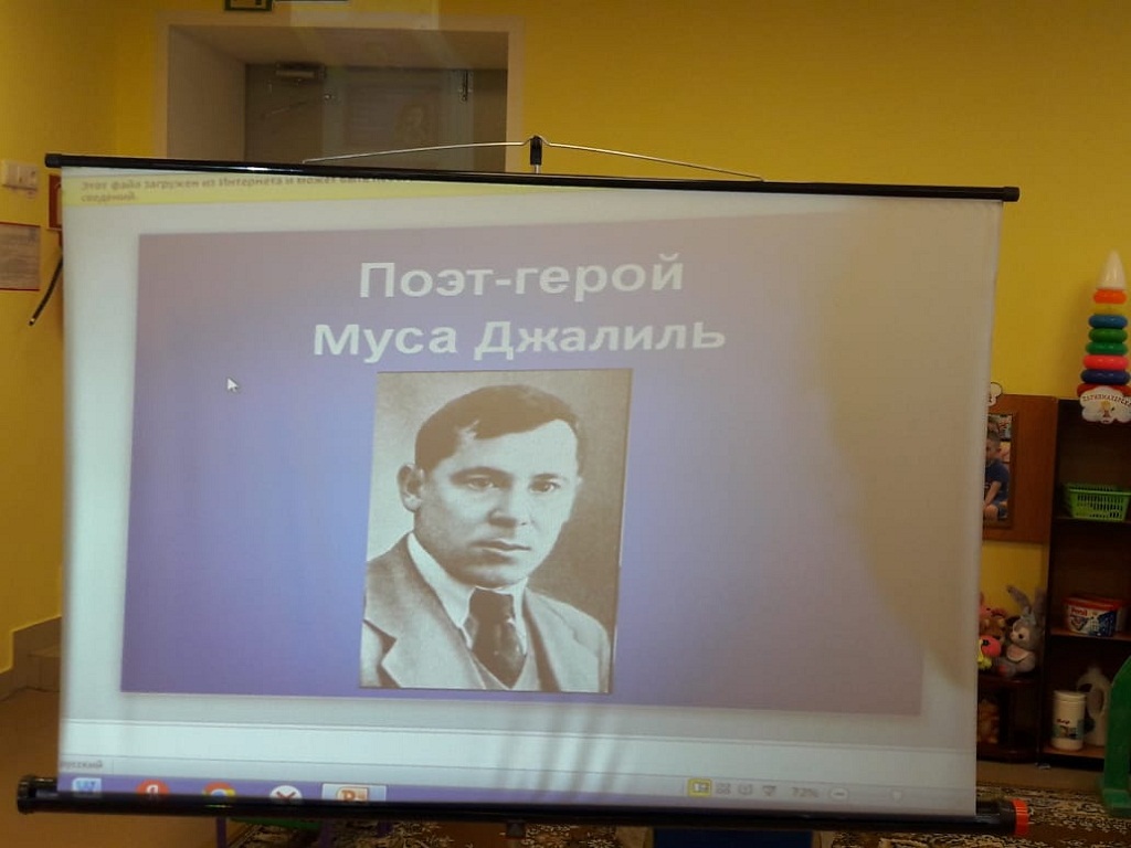 Сотрудник городской библиотеки филиала №3 организовала книжную выставку «Поэт-герой Муса Джалиль. Мероприятие прошла в ДОУ №19 в подготовительной группе, так же присутствовали воспитатели детского сада.
