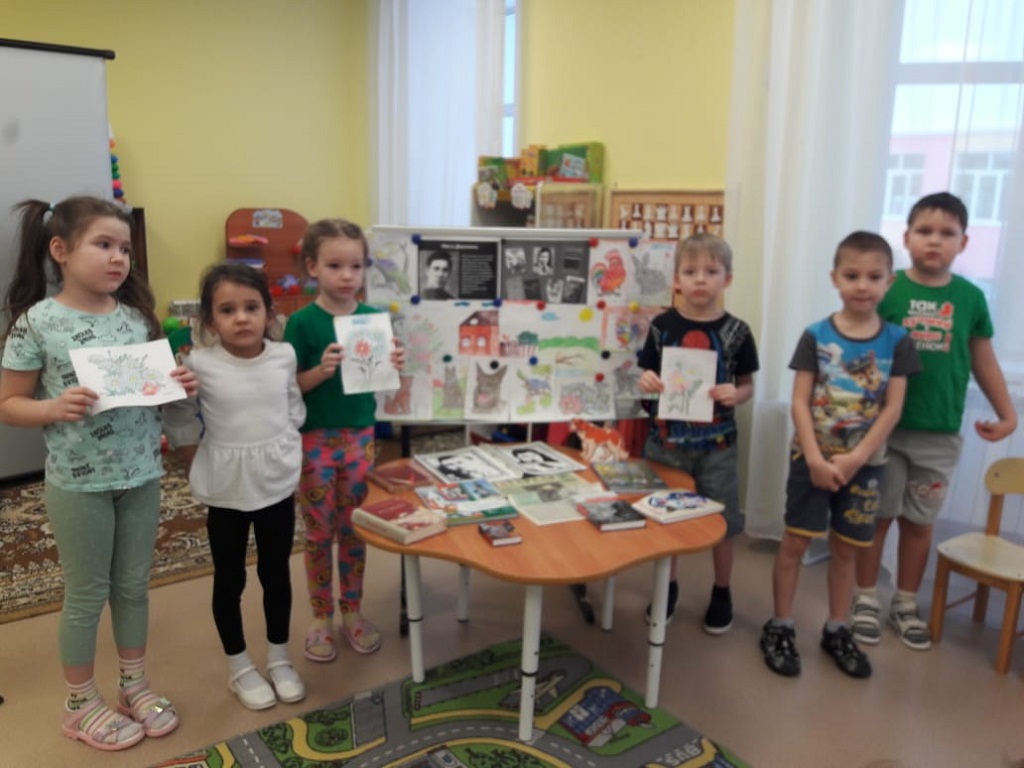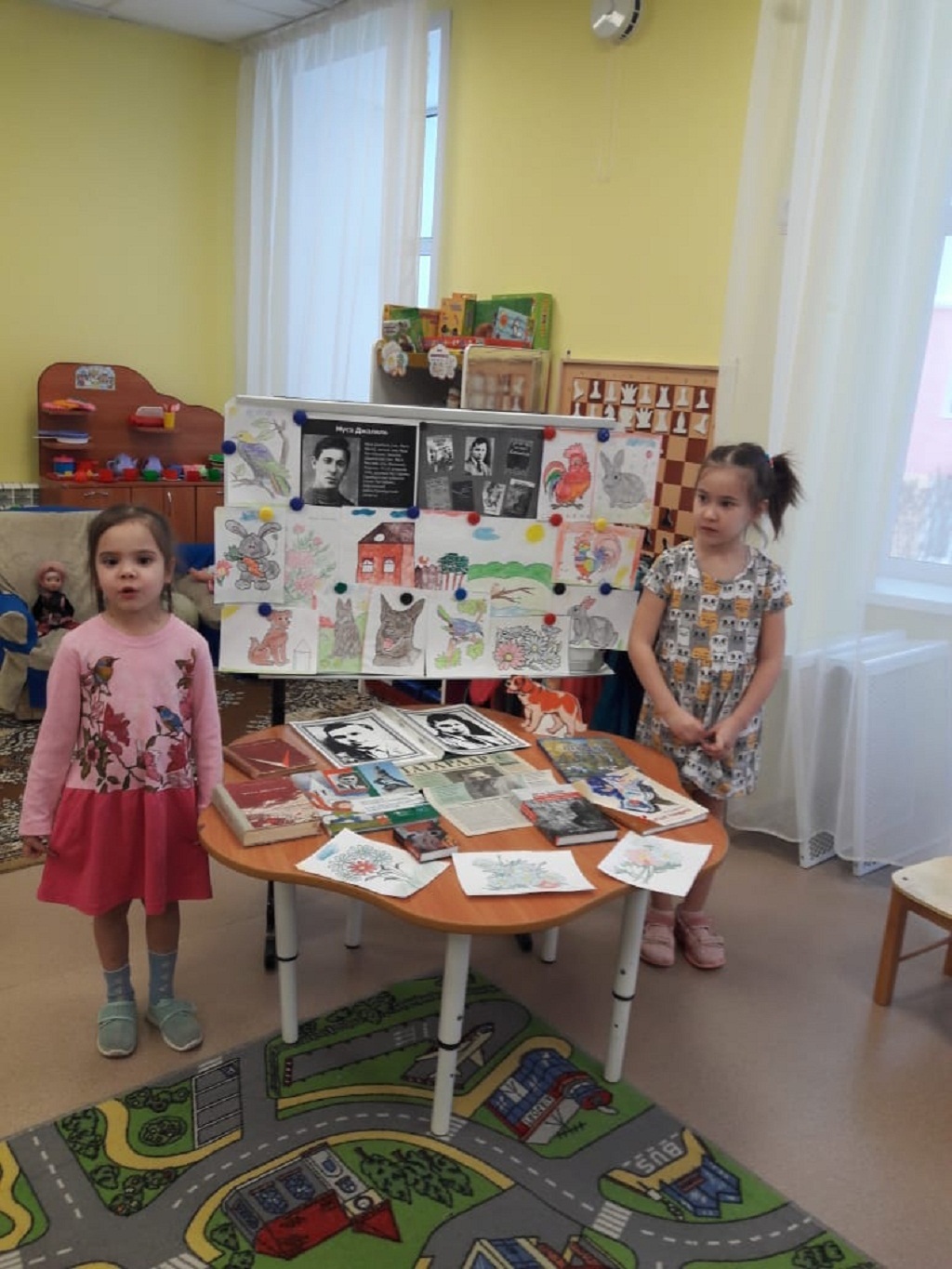 Ребята читали стихи на татарском языке: «Красная ромашка». Была оформлена выставка рисунков по произведениям Мусы Джалиля. Все книги на выставке взяты из фонда библиотеки.