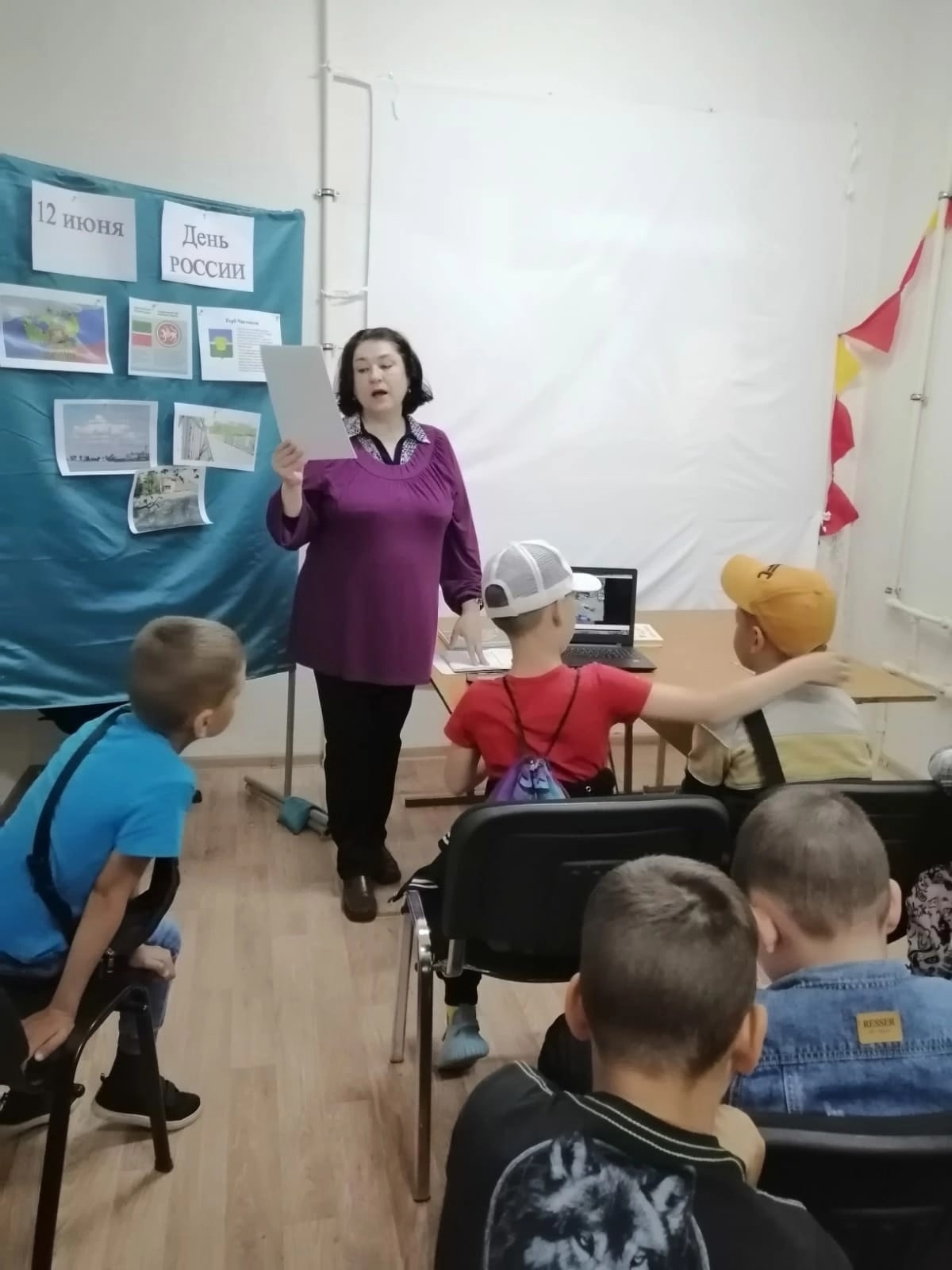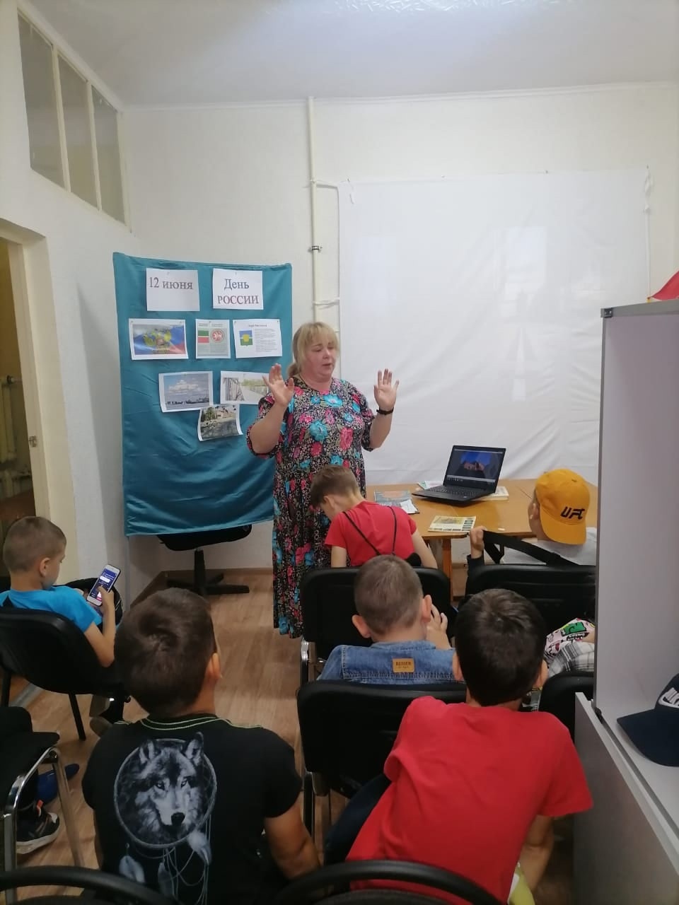 Городская библиотека – филиал № 7 совместно с ТОС № 7 в здании ТОСа провели литературно – познавательную программу «Широка страна моя родная» для детей пришкольного лагеря «Непоседы»( Школа № 4). К мероприятию был оформлен стенд «12 июня – День России» из рисунков детей и фотографий пенсионеров. Библиотекарь Елена Быкова рассказала о празднике, о России, Татарстане, о символах государства: гимне, флаге и гербе. Дети отвечали на вопросы и показали отличные знания по символам России. Рассказ библиотекаря и руководителя ТОС№ 7 сопровождался мультимедийной презентацией. От рассказа о России и Татарстане перешли к малой Родине, говорили о Чистополе и посёлке Водников. Детям представили самые важные объекты посёлка, в стихах, рассказах и открытках на экране. В конце встречи дети спели песни «Пусть бегут неуклюже», «От улыбки», поиграли в настольные игры и сделали фотографию на память.