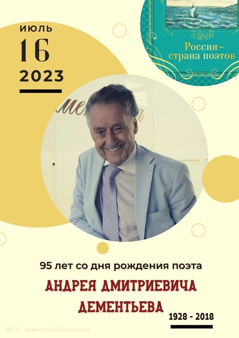 В этом 2023 году, видному советскому и российскому поэту Андрею Дмитриевичу Дементьеву, 16 июля отмечают юбилей — 95 лет. К сожалению, в 2018 году Андрей Дементьев ушел из жизни, менее месяца не дожив до 90-летия. На этот год в России намечена целая плеяда мероприятий, включая выставки, концерты, музыкальные и поэтические встречи в память Андрея Дементьева. Они пройдут во всех городах России, так как Дементьев – далеко не «тверской поэт», а всероссийская величина. Завершит юбилейный год А.Д. Дементьева гала-концерт в Большом Кремлёвском дворце, запланированный на 18 ноября 2023 года.