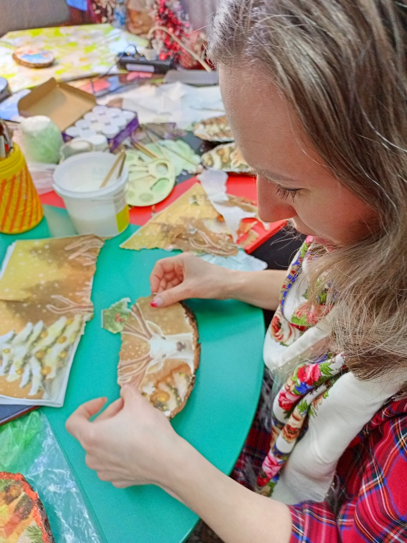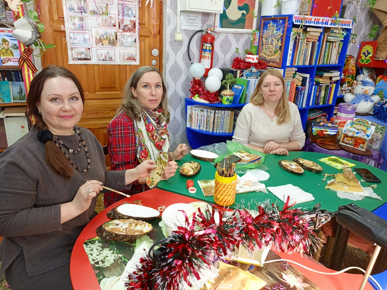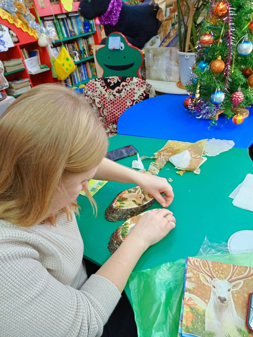 В городской библиотеке – филиале № 7 состоялось открытие нового клуба «ДевЧата». В декабре 2023 года ими были выполнены работы «Волшебный фонарь» на высшем уровне. И вот открытие нового клуба и мастер – класс декупаж на спилах «Новогодняя картинка». Спилы для участников клуба приготовил Алексей Базаров. В работе использовались: спилы, декупажные салфетки, клей, акриловые краски. Все работы получились очень красивые. В клуб приглашаются женщины, которые тоже хотят вместе с нами создавать такие удивительной красоты работы.