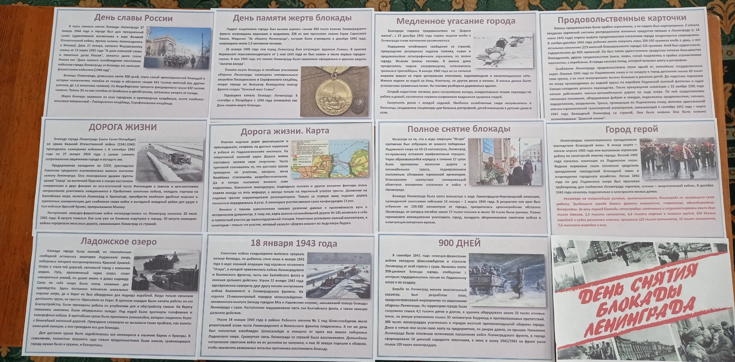 Урок напомнил о трагедии целого города, которая развернулась среди общего горя Великой Отечественной войны: пока мы помним о наших героях, пока сохраняем память о них, они живы в наших сердцах – это значит, что они воевали не зря. К уроку была оформлена информационная выставка «Дорога жизни» — «Ты выжил Ленинград».