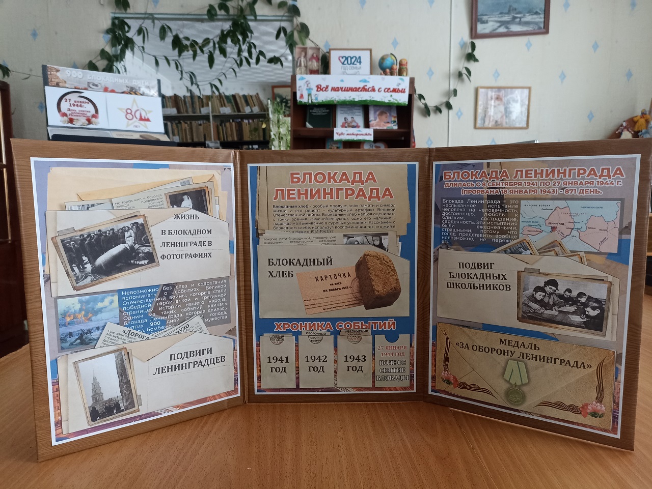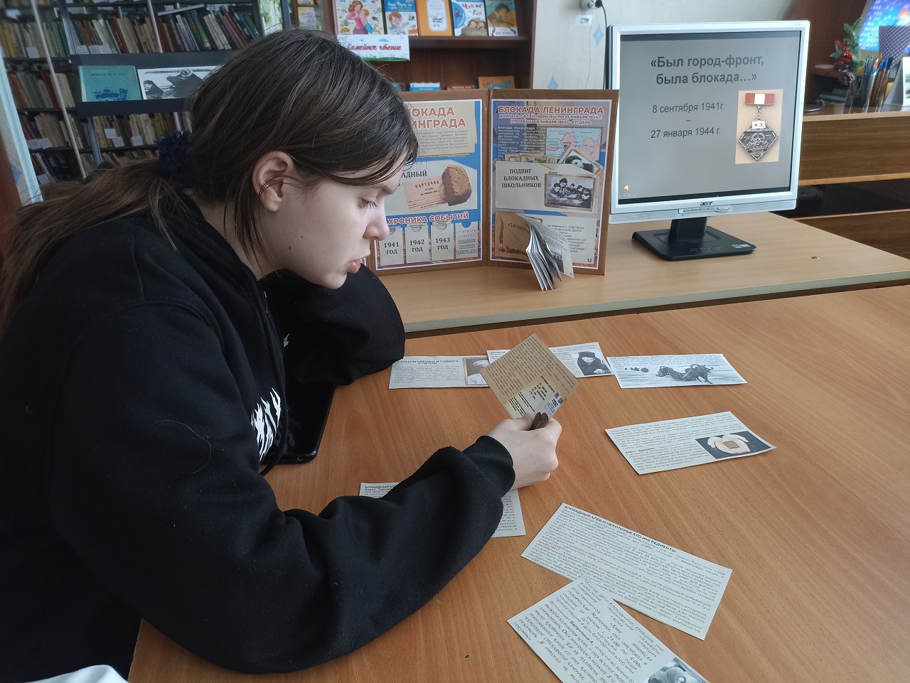 Участники мероприятия познакомились с выставкой «900 блокадных дней» и лэпбуком «Непокоренные. Город-герой Ленинград»