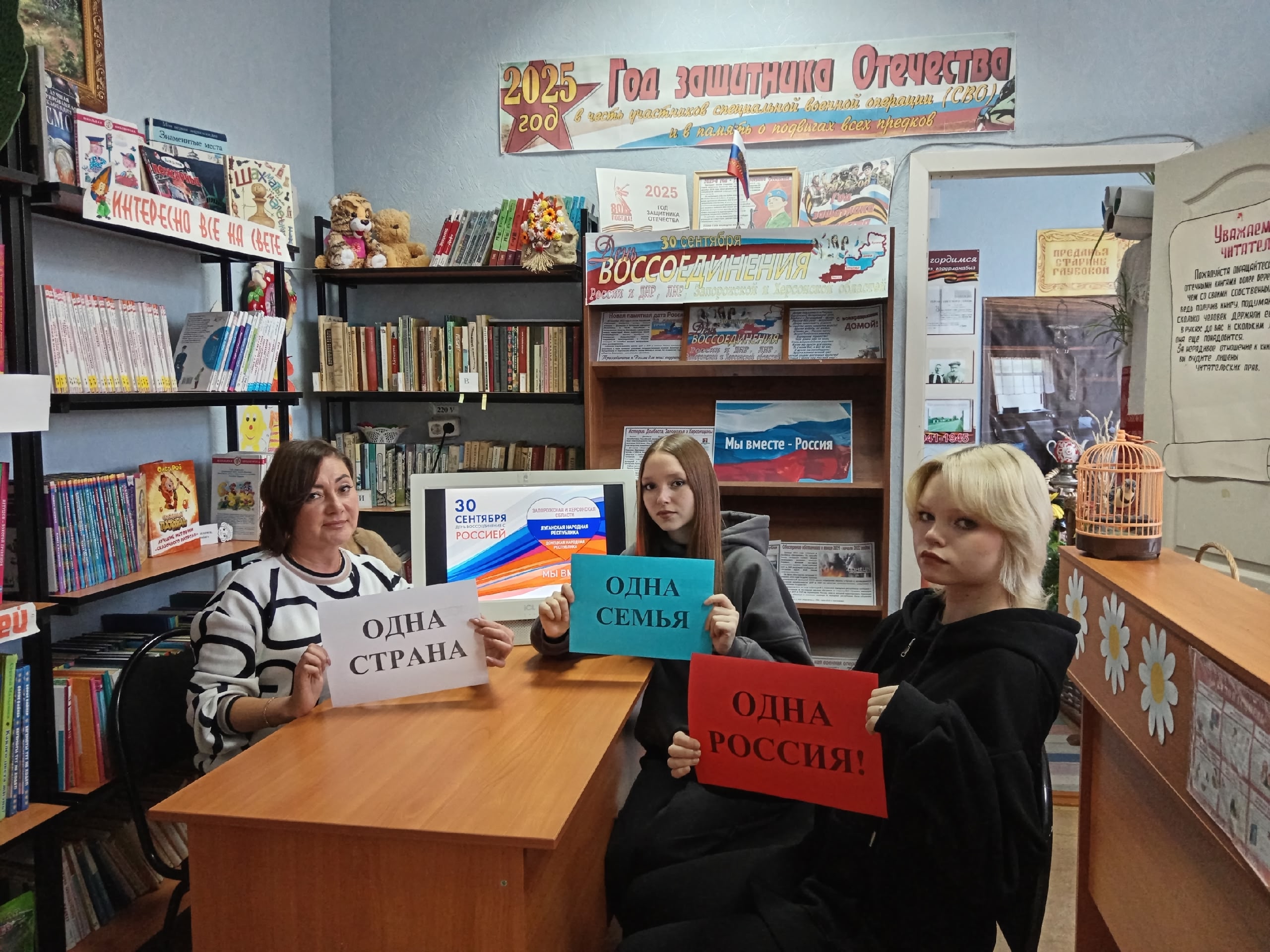 Ко Дню воссоединения России ДНР, ЛНР, Запорожской и Херсонской областей для студентов в Малотолкишской сельской библиотеке был проведён патриотический час «Вновь в единстве с Россией». Библиотекарь рассказала о том, как произошло воссоединение с Россией осенью 2022 года, какой трудный путь прошли в течении восьми лет жители регионов, которые отстаивали своё право говорить на родном языке добиваясь независимости и как это отразилось на современной политической обстановке. И несмотря на все вызовы жизнь в регионах стремительно развивается в составе сильного и суверенного Российского государства. Разговор шёл даже о тех, кто сейчас стоит на защите нашей Родины об героях нашего времени, участников СВО, которые проявляют себя как настоящие патриоты, страны и достойно продолжают дело наших дедов. Вниманию пользователей была показана презентация «Единство народов-несокрушимая крепость». Оформлена иллюстративная выставка «День Воссоединения».
