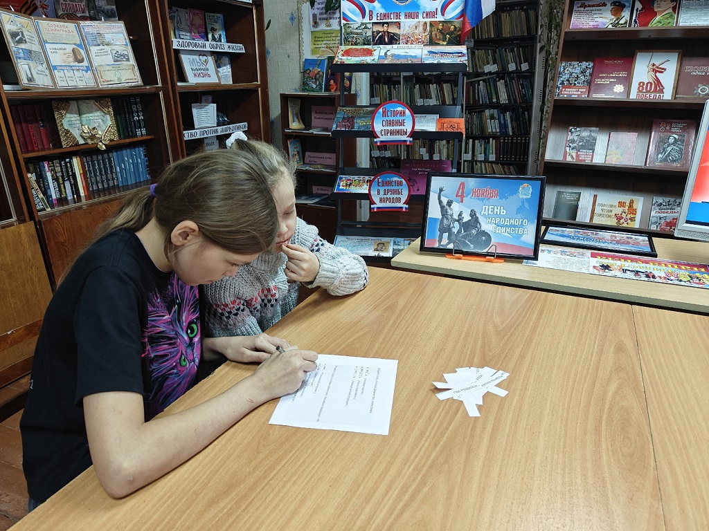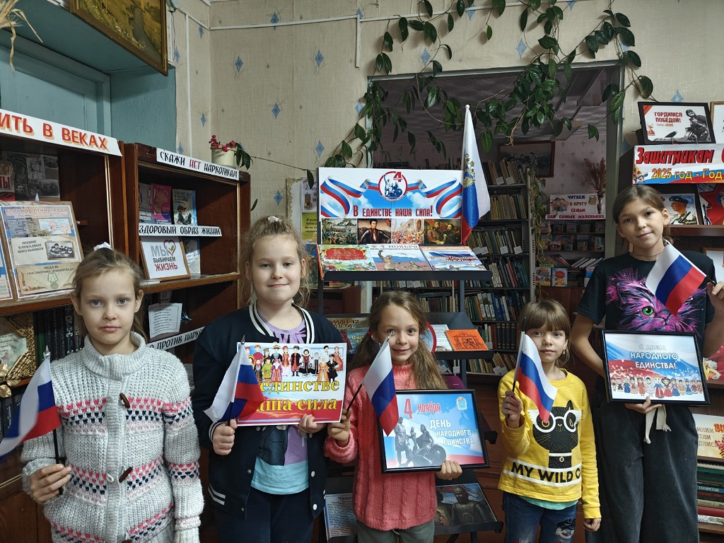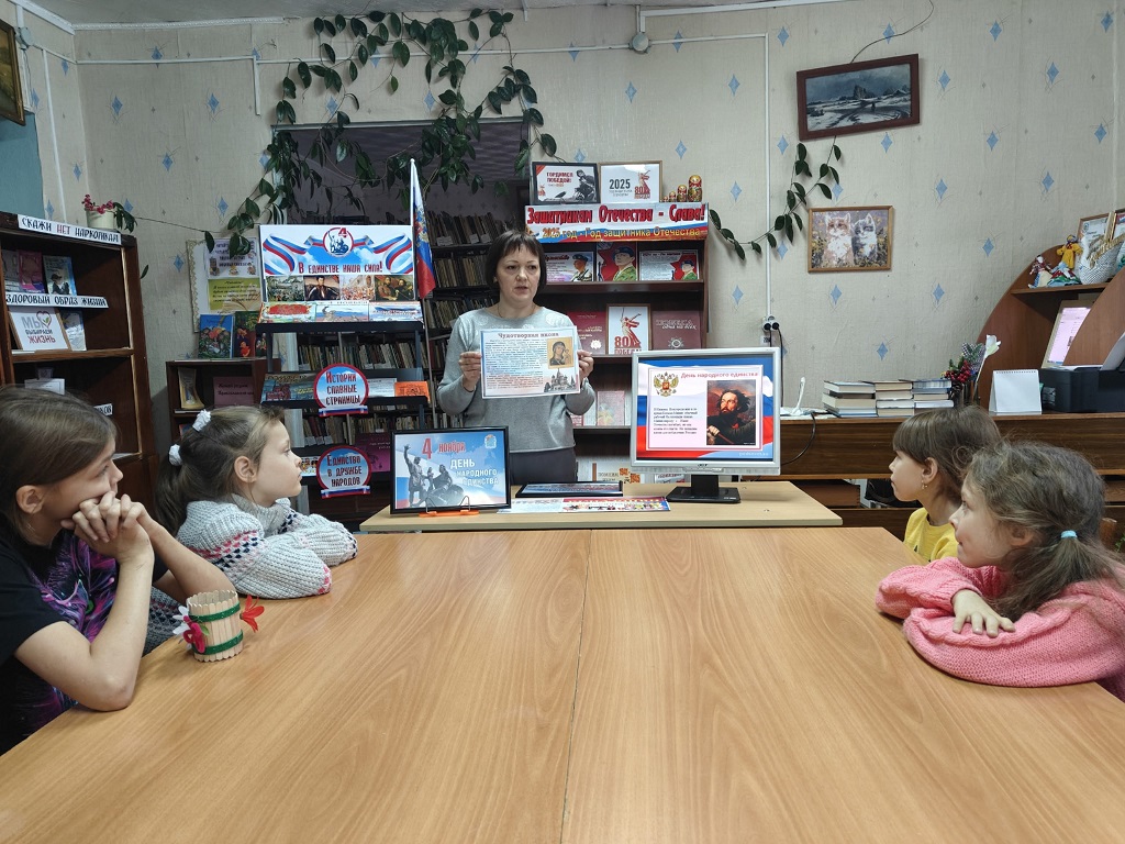 В преддверии праздника в Четырчинской сельской библиотеке состоялся информационный час « В единстве наша сила». Участники мероприятия познакомились с историей возникновения праздника, узнали о подвиге Кузьмы Минина и Дмитрия Пожарского, которые в тяжелое для страны время смогли объединить людей разных сословий и национальностей ради спасения Отечества. Дети познакомились с понятиями «единство», «согласие», активно ответили на вопросы патриотической викторины «Моя Россия», собирали пословицы о дружбе и единстве. Библиотекарь рассказала школьникам, что во взаимопомощи, поддержке и дружелюбии заключаются главные человеческие качества, которые помогают поддерживать народное единство, жить в мире и добре. Ребята также познакомились с литературой, отражающей богатство и разнообразие культур народов России. Данное мероприятие позволило молодым участникам расширить свои знания о родной стране.