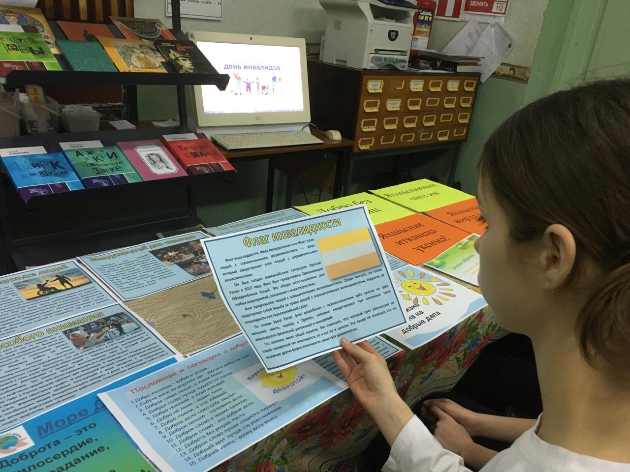 Рассказала об учреждениях, работающих с инвалидами, с гражданами пожилого возраста, что доброта и милосердие – основные ценности человечества. Ребята читали стихотворения о доброте, добрых поступках, озвучили крылатые фразы и высказывания известных людей на тему доброты. Дети размышляли: что такое добро, какой человек добрый, какие поступки его украшают, почему с каждым днем на земле добра становится все меньше и меньше. Главное необходимо помнить: инвалид – такой же человек, как и все, только жить ему гораздо труднее, чем человеку здоровому. Лишь доброта и участие спасут мир. К мероприятию оформлена выставка.