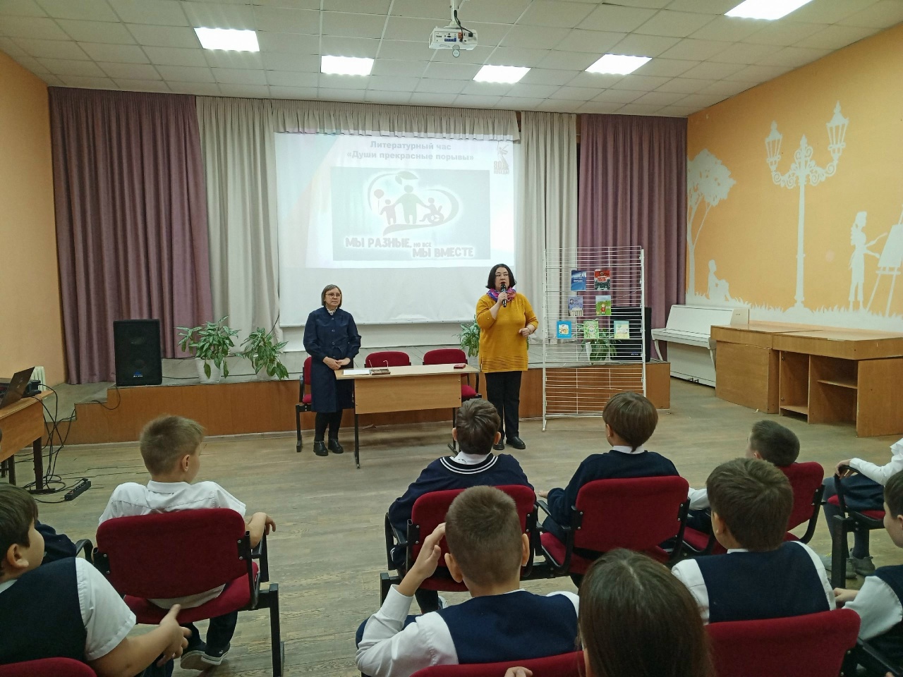 2 декабря в актовом зале школы № 4 для детей из всех четвёртых классов был проведён литературный час «Души прекрасные порывы». Мероприятие было посвящено декаде инвалидов. В гости к детям пришла талантливая чистополка Наталья Курнавенкова. Наталья Фёдоровна читала авторские стихи и рассказы, отвечала на вопросы, даже показала одно движение из танца «Ча – Ча- ча». Ведущей встречи была библиотекарь Елена Быкова. Елена Валерьевна познакомила детей с творческой биографией Натальи, читала стихи и рассказы, которые вошли в республиканский сборник «Вдохновлённые родным краем» и стихотворение «Война лишила меня деда» из книги «Солдаты Победы»- 4. Дети были удивлены, что Наталья Фёдоровна, не только пишет стихи и рассказы, а ещё и рисует, танцует, играет на гитаре, выращивает цветы, фрукты и овощи в своём саду. Так же она рассказала детям о том, что стала недавно мастерить игрушки из ваты. Из этой встречи дети поняли, что пенсионеры – инвалиды, очень увлечённые люди и с них можно брать пример жизнелюбия. Ещё ребятишки узнали, что никогда не поздно чему то научиться полезному и интересному, и конечно же то, что надо уважать и заботиться о больных и стареньких бабушках и дедушках.