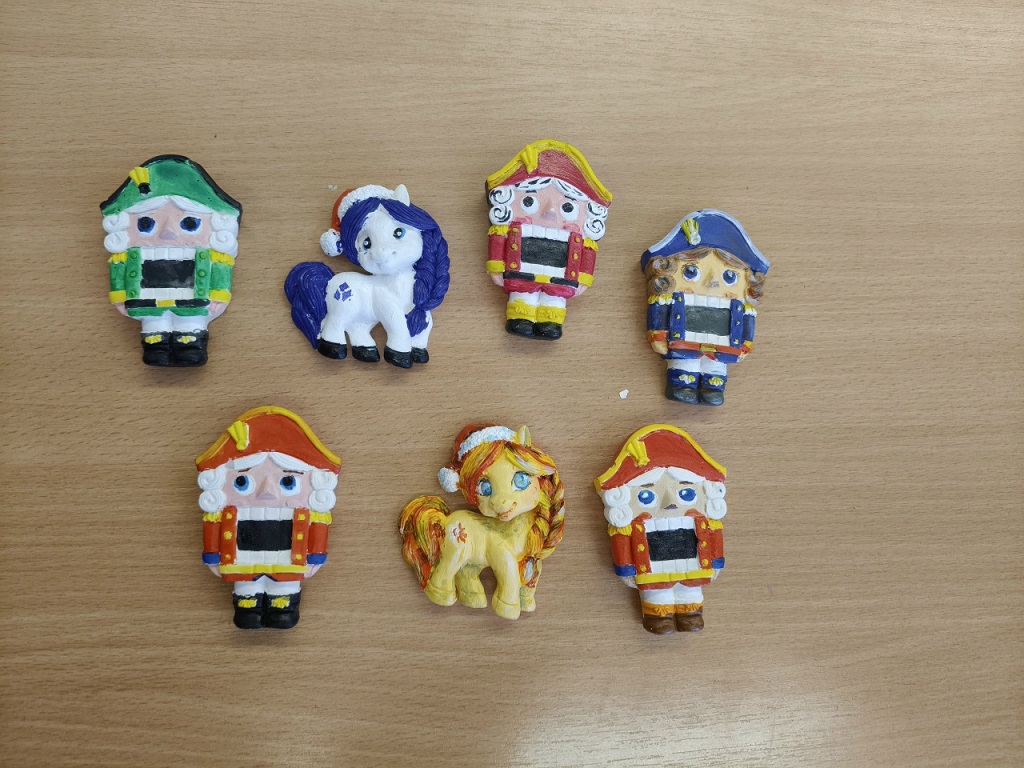 Ребята раскрашивали акриловыми красками гипсовые барельефы «Щелкунчик» и символ наступающего года «Лошадку». Такие барельефы станут прекрасными подарками друзьям и родным в качестве ёлочных игрушек либо магнитов.