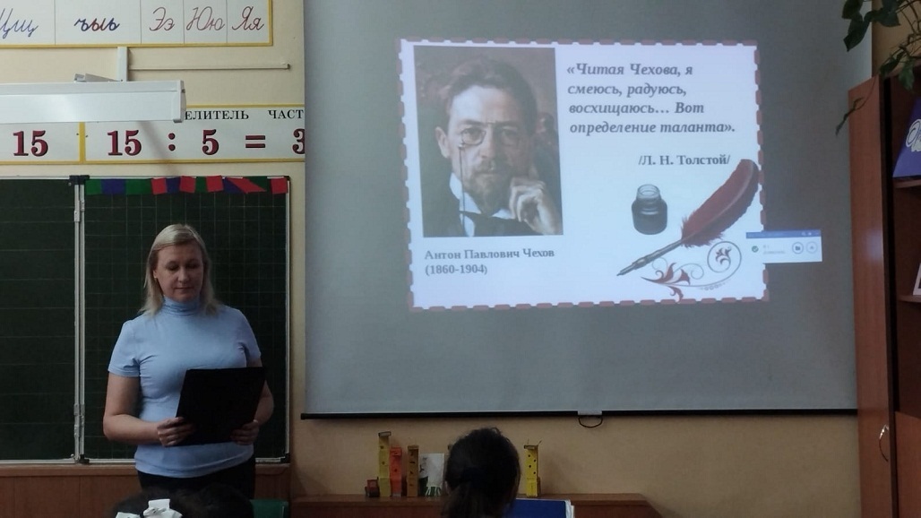 Ребятам был предложен видеолекторий чеховских рассказов. Его герои — чиновники, крестьяне, врачи, инженеры, студенты попадают в анекдотические ситуации, в которых и раскрывается их суть. С помощью сатиры и юмора писатель высмеивает их пороки.