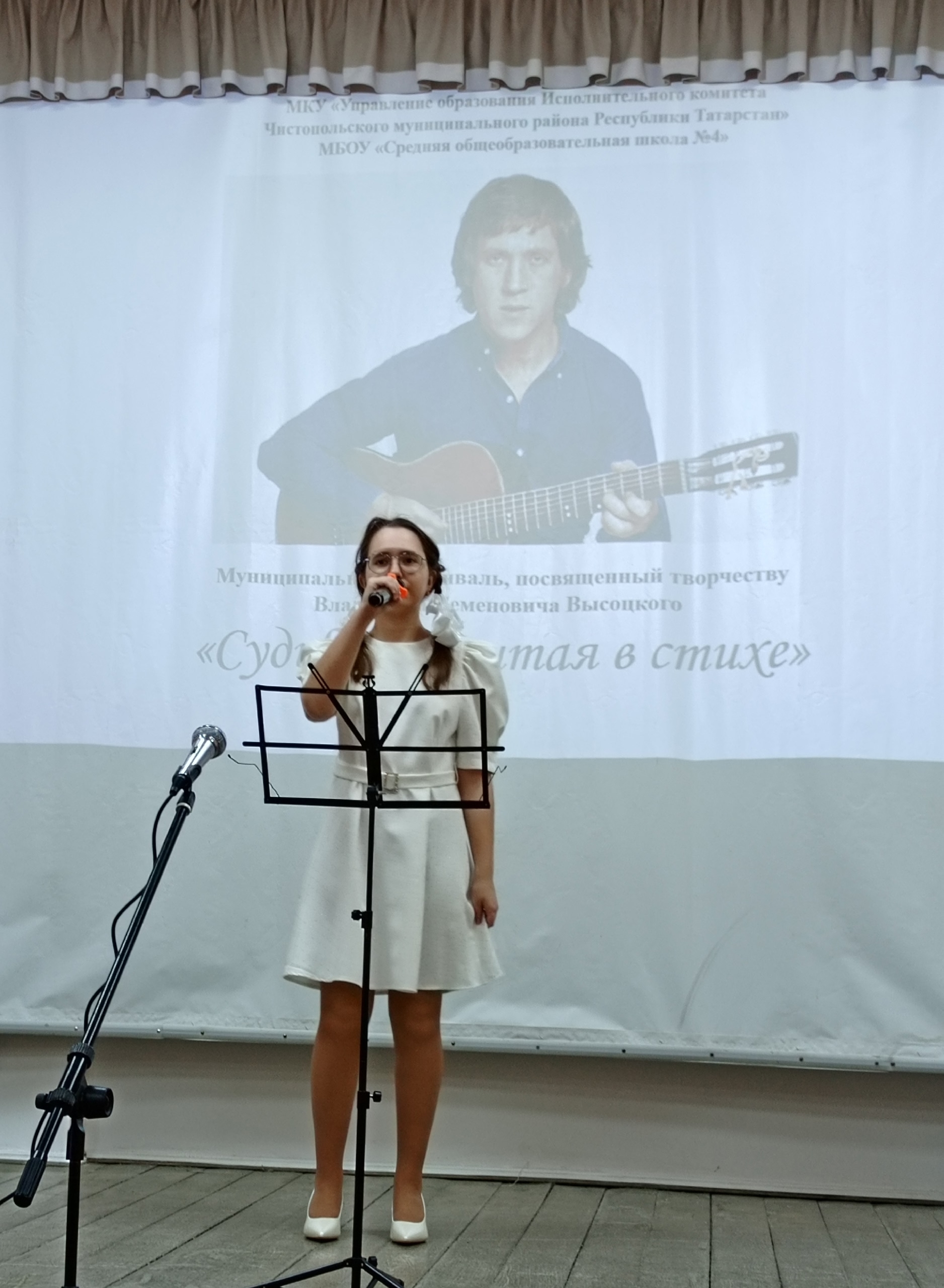 23 января в школе № 4 прошёл девятый Муниципальный фестиваль, посвящённый творчеству Владимира Высоцкого «Судьба, отлитая в стихе». Идея фестиваля принадлежит школьному библиотекарю Жильцовой Ольге Леонидовне. Из разных школ города и района съехались участники, которые эмоционально и с душой читали стихи и рассказы, посвящения поэту, авторские стихи и исполняли песни великого барда. Компетентное жюри, в которое входили: представитель отдела образования, автор- исполнитель, учитель и библиотекарь наградили детей и подростков Дипломами победителей и Сертификатами участников.