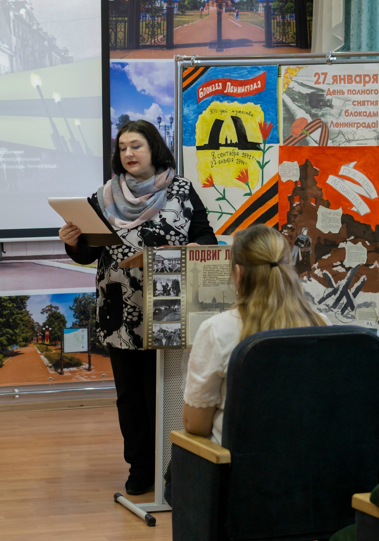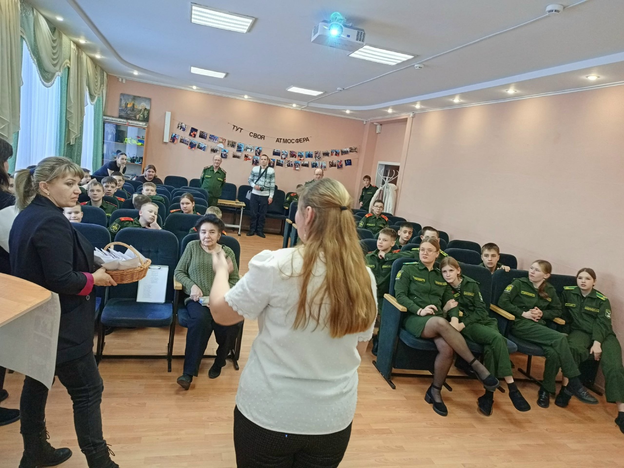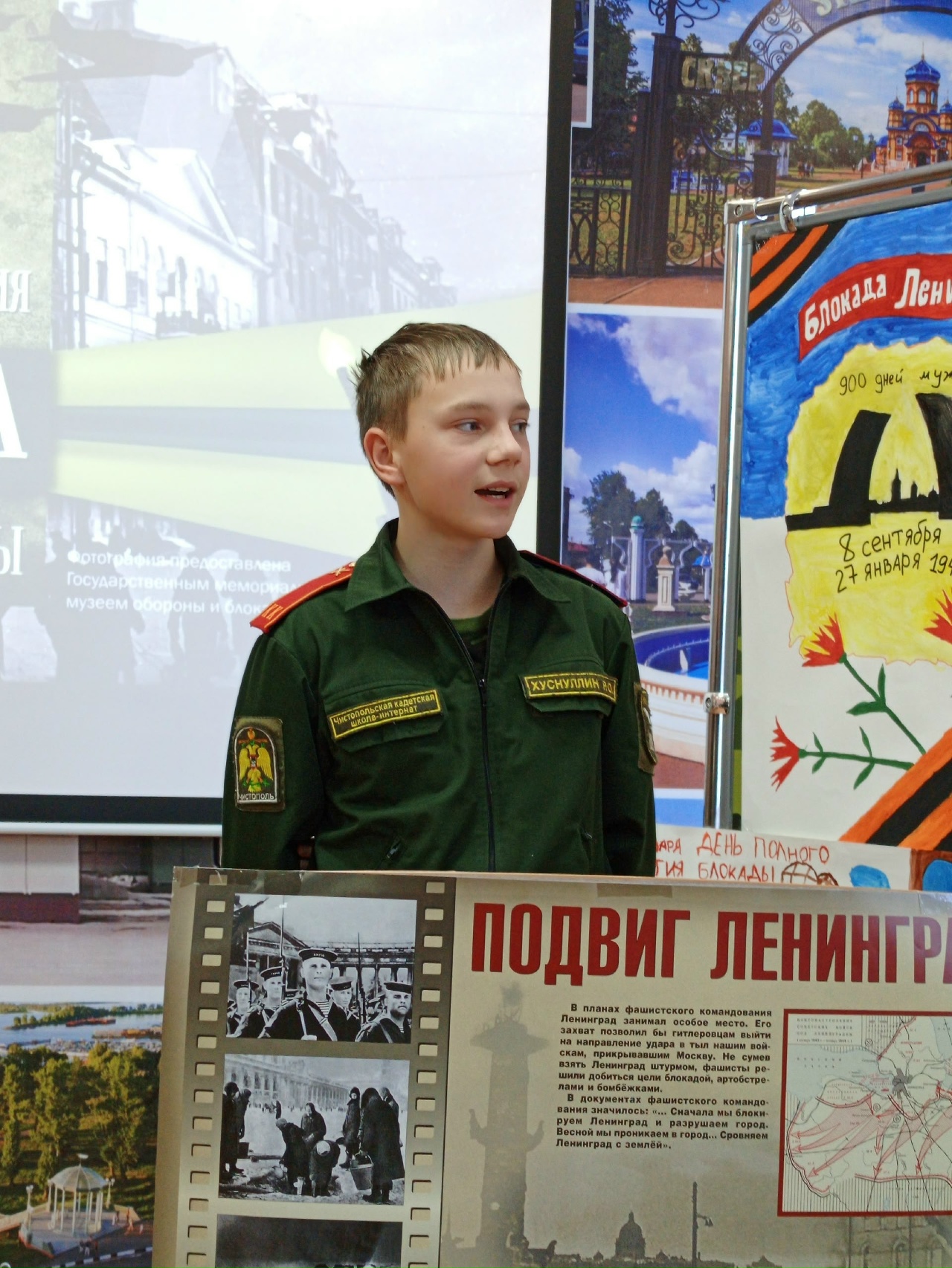 27 января — особая дата в истории нашей страны. 82 года назад 27 января 1944 года была полностью снята блокада Ленинграда. Мероприятие для учащихся кадетской школы приготовили совместно педагоги, библиотекари и представители «Движения Первых». Библиотекарь Елена Быкова прочитала стихотворение Ольги Бергольц «Первое письмо на Каму», рассказав, что Бергольц работала на радио в блокадном Ленинграде, а её мама жила в нашем Чистополе. Елена Валерьевна сделала сообщение об истории Блокады в цифрах и фактах; провела викторину по своему сообщению; так же поделилась информацией из просмотренных документальных фильмах и прочитанных книгах о блокаде. У кадетов было домашнее задание – нарисовать плакаты и выучить стихи. Очень проникновенно два учащихся школы читали стихи. На урок к кадетам пришли представители «Движения Первых», они наградили наборами для творчества победителей конкурса плакатов. Педагог — организатор Альбина Владимировна показала детям документальный фильм, озвученный 7 симфонией Шестаковича, провела викторину по историческим событиям блокадного времени. Учащиеся, весь материал запомнили на отлично, и чётко отвечали на вопросы викторин. Все активные участники патриотической программы получили в подарок уникальные предметы: блокадную зелёную ленточку с застёжкой, которую можно носить, карточки на хлеб и конверты с 125 граммами хлеба, на конверте можно было прочитать, из чего пекли блокадный хлеб.