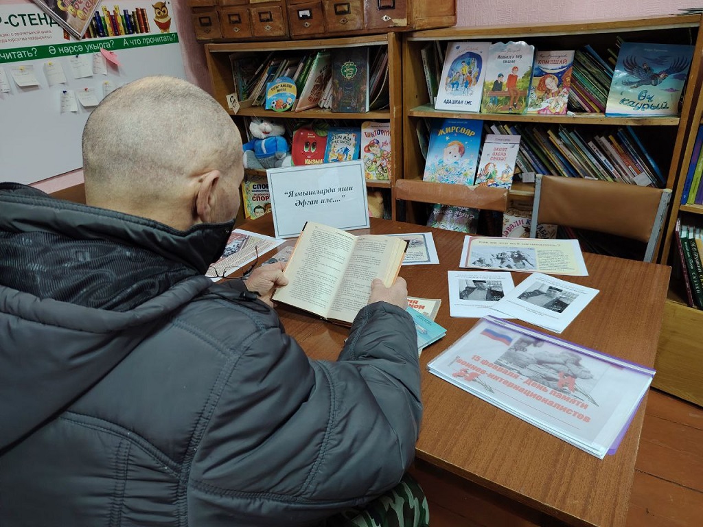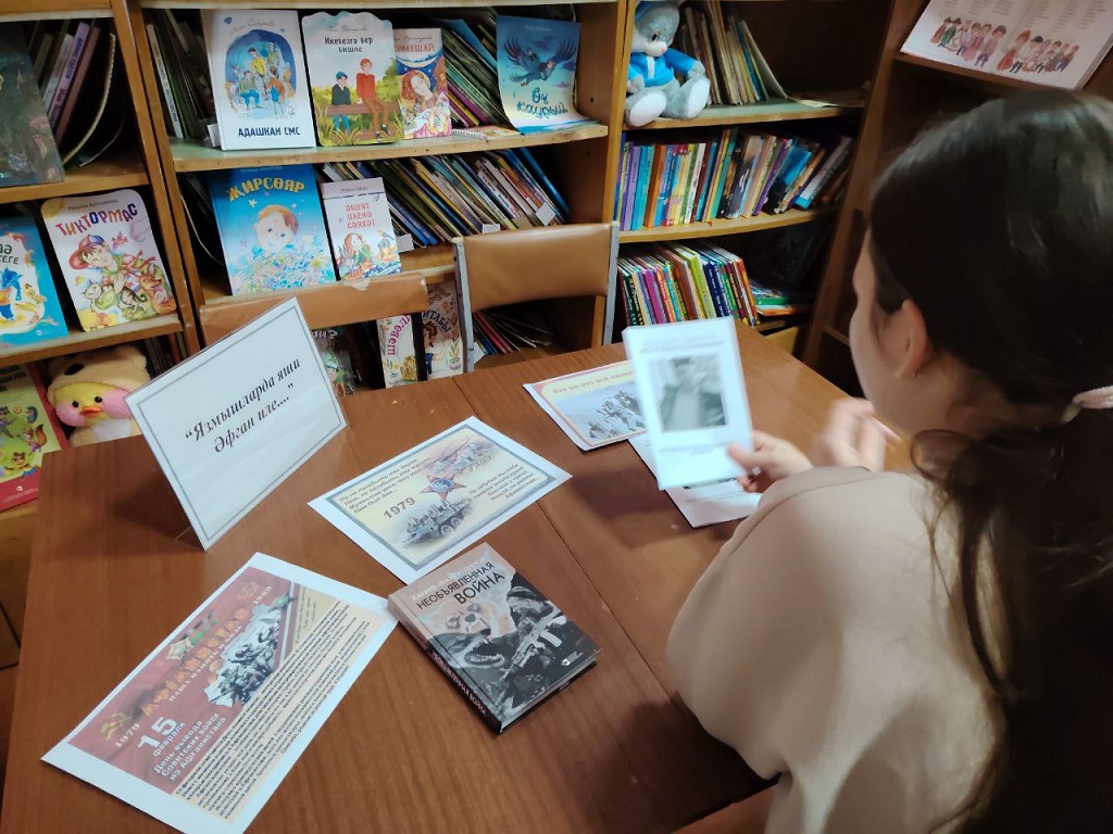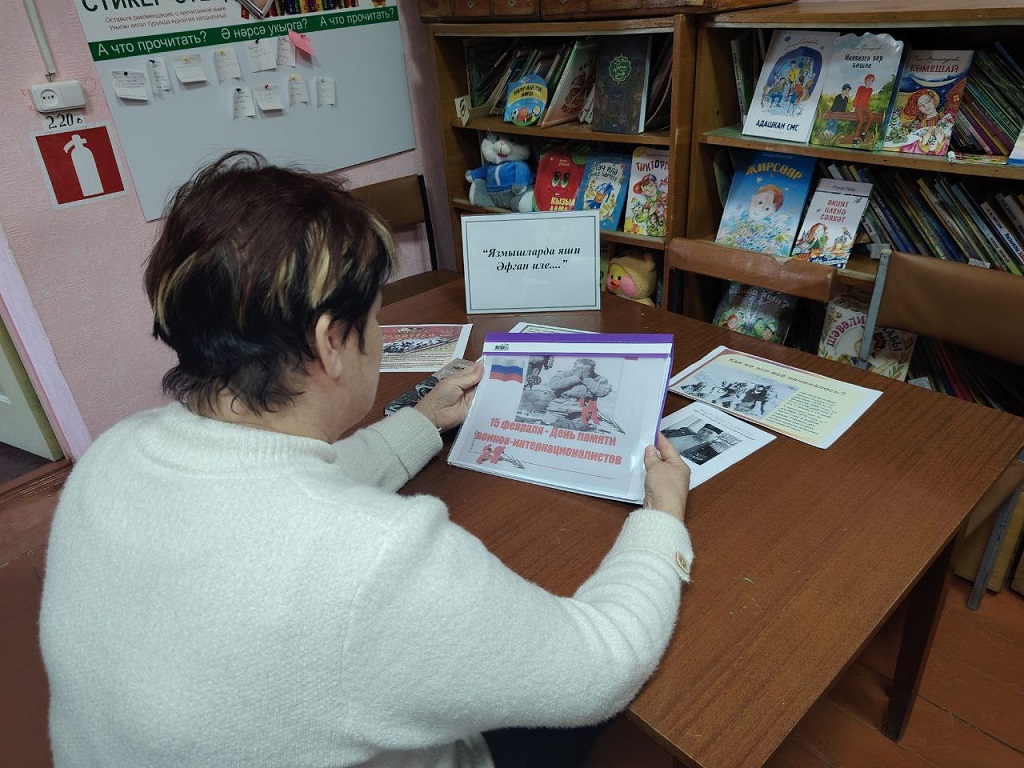 В течение недели Муслюмкинской сельской библиотеке читатели знакомились информационной выставкой «Язмышларда яши Афган иле» («Афганистан в судьбах») ко дню посвещенную памяти воинов- интернационалистов и событиям Афганской войне. На выстаке были представлены документы и фотографии, рассказывающие о событиях войны . Литература посвещенная подвигам солдат и офицеров . Каждая из них раскрывается через подобранные книги, статьи, фотографии и материалы. Читатели обсуждали прочитанные книги, представленных на выставке. с историей Афганской войны, узнали о причинах начала и ее продолжительности, о невосполнимых потерях советских войск, о наших земляках, которым судьба предначертала жестокую участь которым уже никогда не суждено переступить порог родного дома. Минутой молчания почтили память о всех павших наших солдат и офицеров, отдавая дань уважения тем, кто проявил высочайшую силу духа, самоотверженность, героизм, выполняя боевой долг, прочли стихи, рассказала о земляках, которые выполняли свой интернациональный долг в Афганистане. Среди них: Валеев Р.Ш., Валеев Ф.Р, Садыков А.И., Зайнуллин Ф.А., Камалов Ф.А., Валиуллин Талгат Рашитович 1981 году умер в городе Кабул во время службы.
