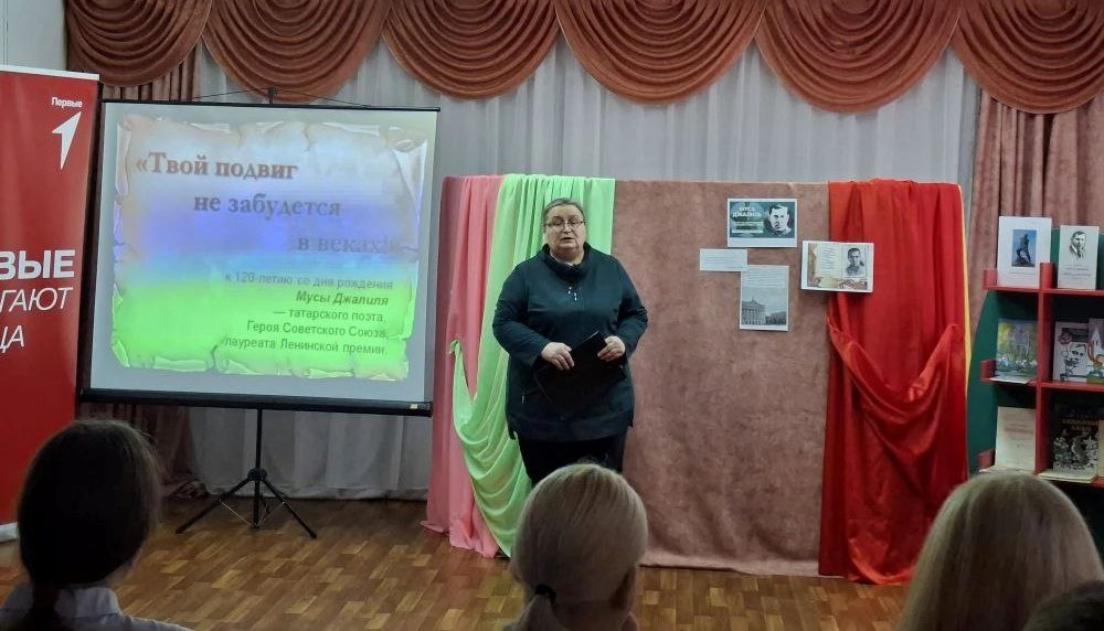 Библиотекарь познакомила школьников с биографией Джалиля, его общественной и литературной деятельностью. Особое внимание в рассказе о поэте было уделено самым трагическим страницам его жизни: пребыванию в плену и героической гибели Мусы Джалиля. Рассказ сопровождался чтением стихов и просмотром фрагмента из кинофильма «Муса Джалиль. Приговоренный к бессмертию». А так же видео — интервью с дочерью Мусы Джалиля Чулпан Залиловой.Кроме того, ребята узнали о памятниках поэту в Москве, Казани и Оренбурге. На мероприятии присутствовал представитель Местного отделения Российского движения детей и молодежи «Движение первых», которая рассказала о важности знания истории нашего края и его героях. В заключение был проведен обзор книжной выставки «Жизнь, отданная борьбе».На ней были представлены сборники стихов «Красная ромашка», «Маобитская тетрадь» и другие издания. Выставка была проиллюстрирована фотографиями М.Джалиля и документальными материалами.