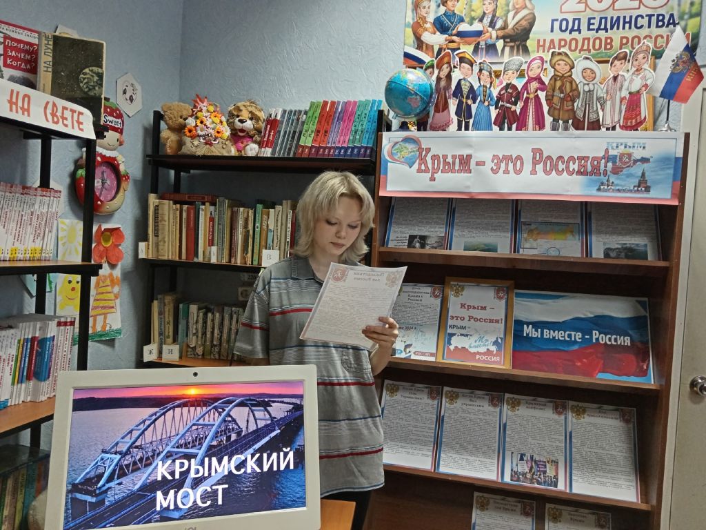 Ко Дню воссоединения Крыма с Россией в Малотолкишской сельской библиотеке было проведено информ-досье «Крым. Мост из прошлого в настоящее». В ходе мероприятия библиотекарь рассказала участникам об истории Крыма, начиная с времён Екатерины || и заканчивая событиями «Крымской весны» 2014 года, когда крымчане сделали свой судьбоносный выбор. Особый акцент был сделан на значимости Крымского моста- грандиозного инфраструктурного проекта, ставшего не только транспортной артерией, но и символом возвращения региона в родную гавань. Также был проведён обзор современных достижений Крыма в составе РФ, где мост символизирует связь времен и поколений. Показана презентация «Крым. Страницы истории». Документальные кадры референдума 2014 года и строительство Крымского моста. Библиотекарь завершила мероприятие словами: «Крымский мост-это не просто инженерное сооружение соединившее берега Керченского пролива. Это рукотворное чудо ставшее символом единства, непрерывности истории и уверенного движения вперёд